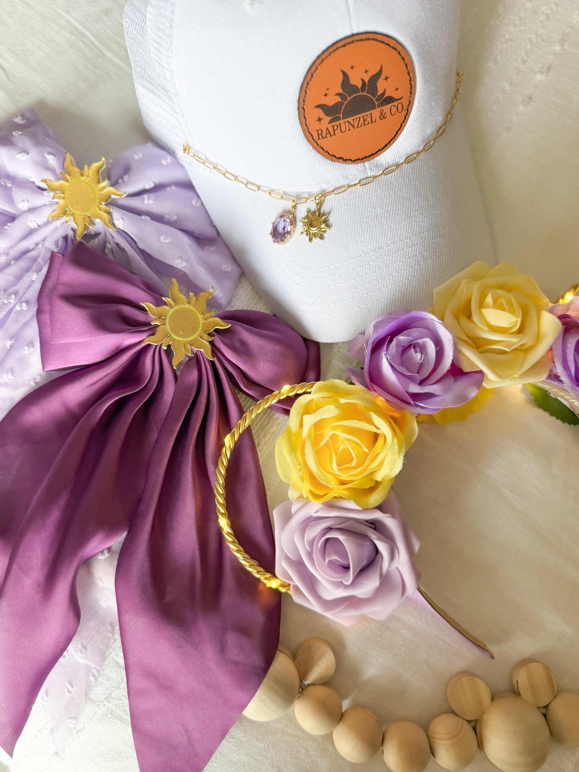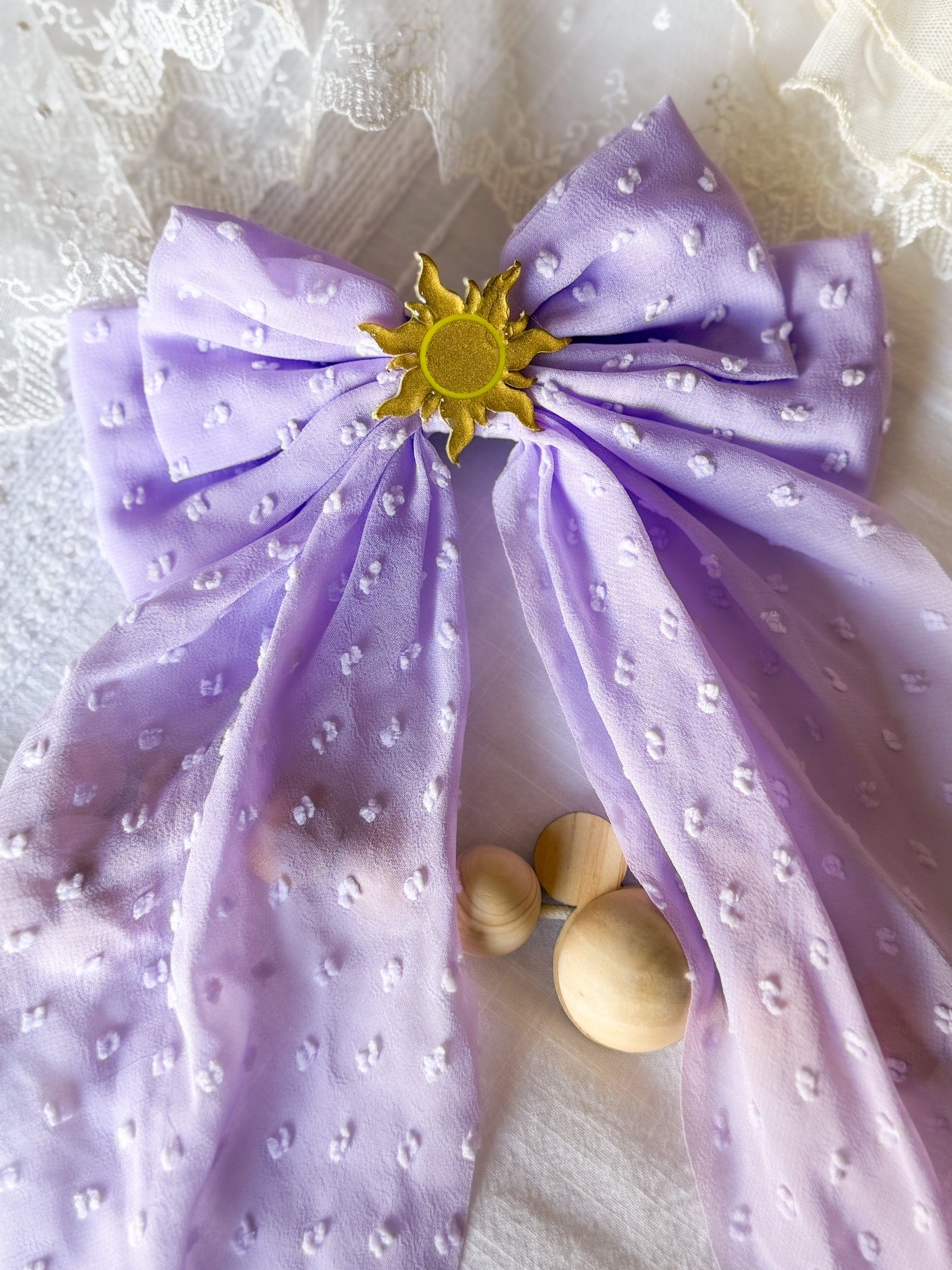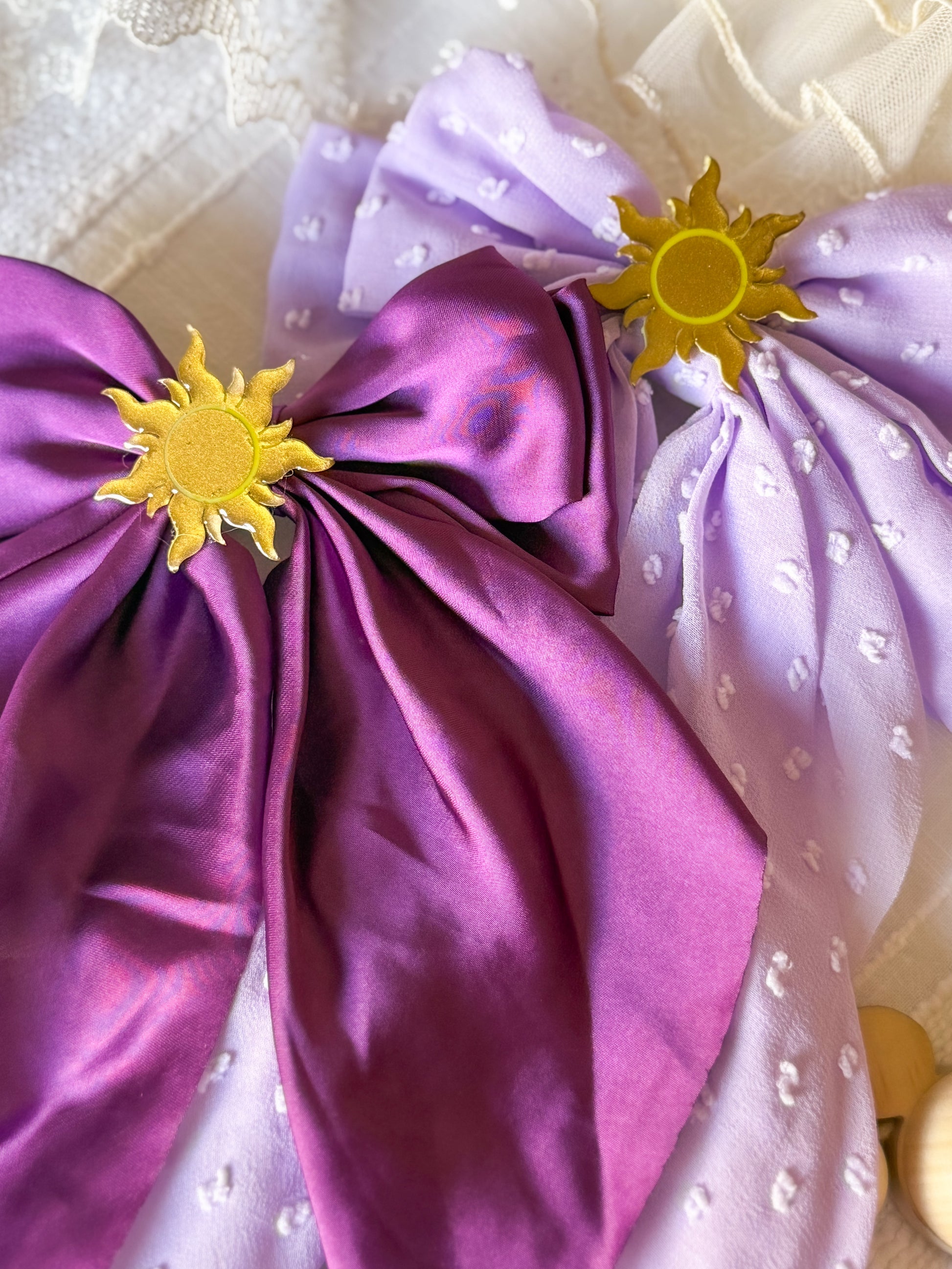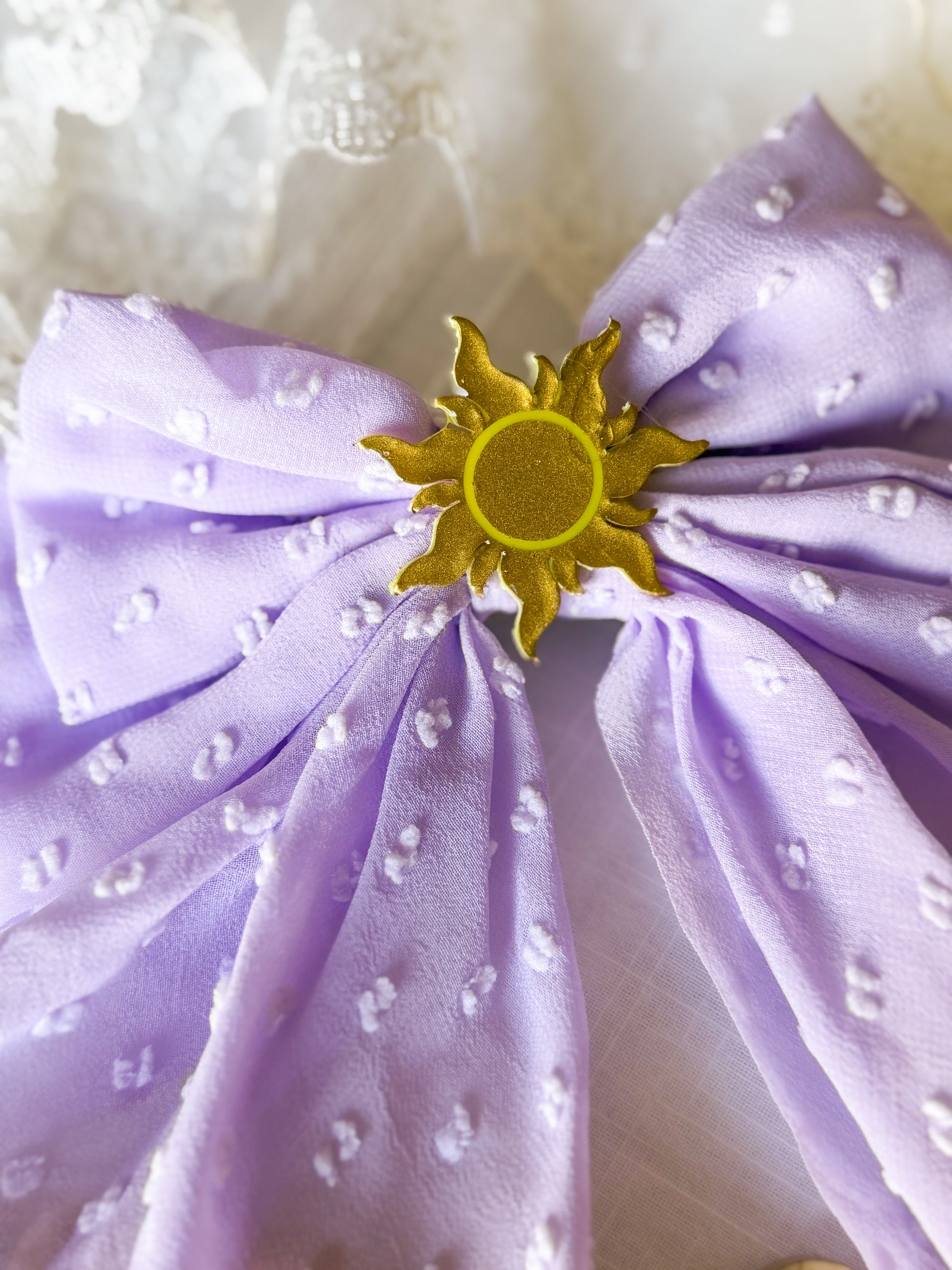 Each bow comes attached to a barrette and completed with an acrylic Tangled sun embellishment adhered onto the front