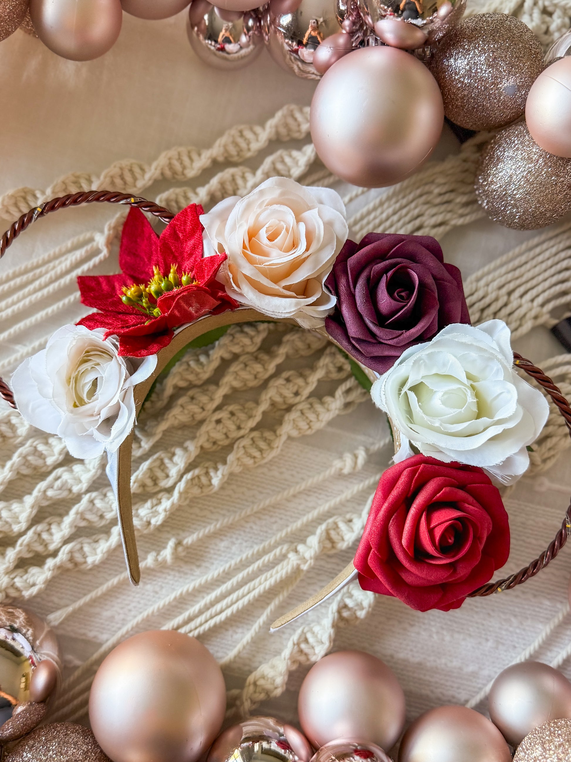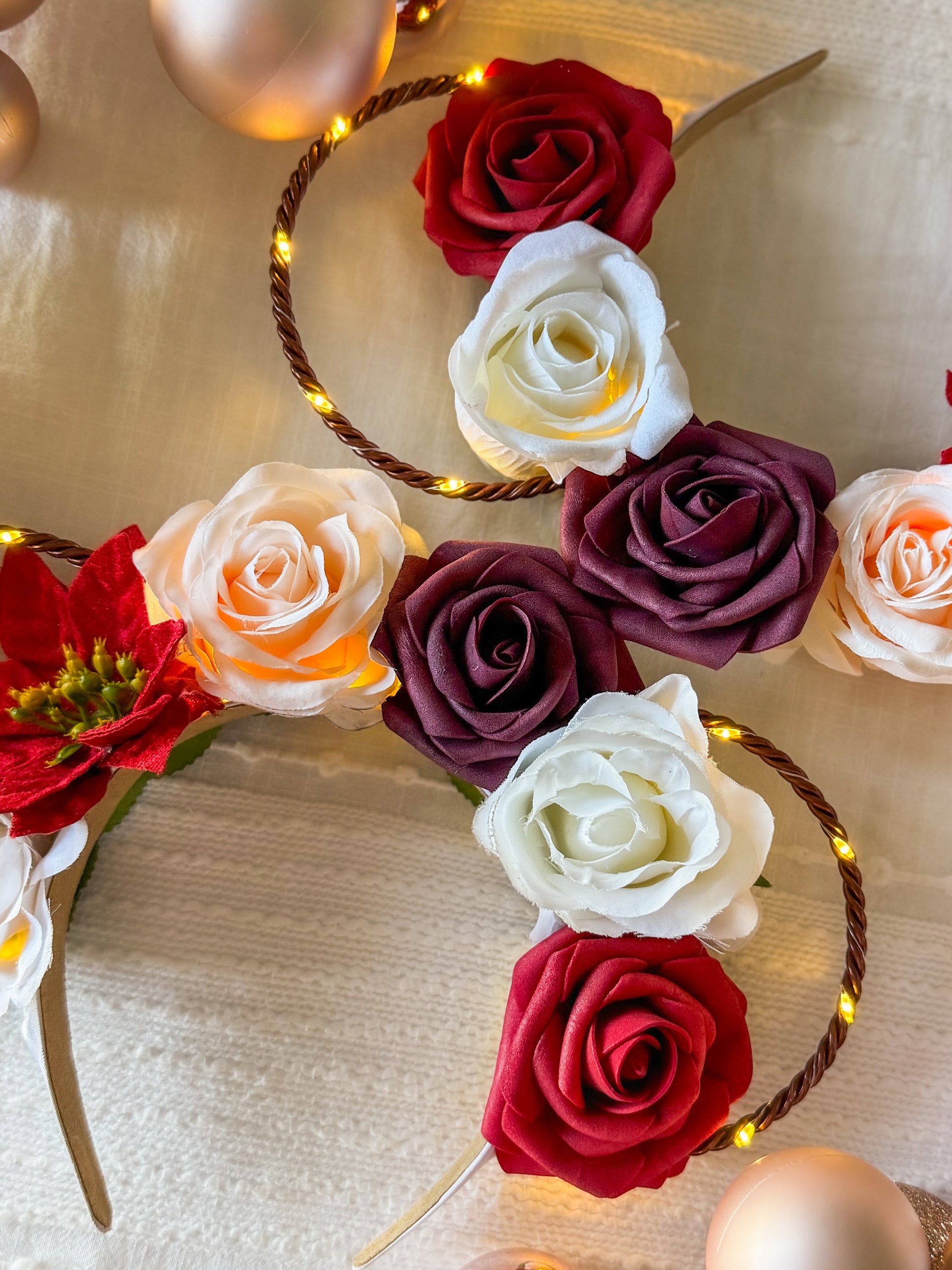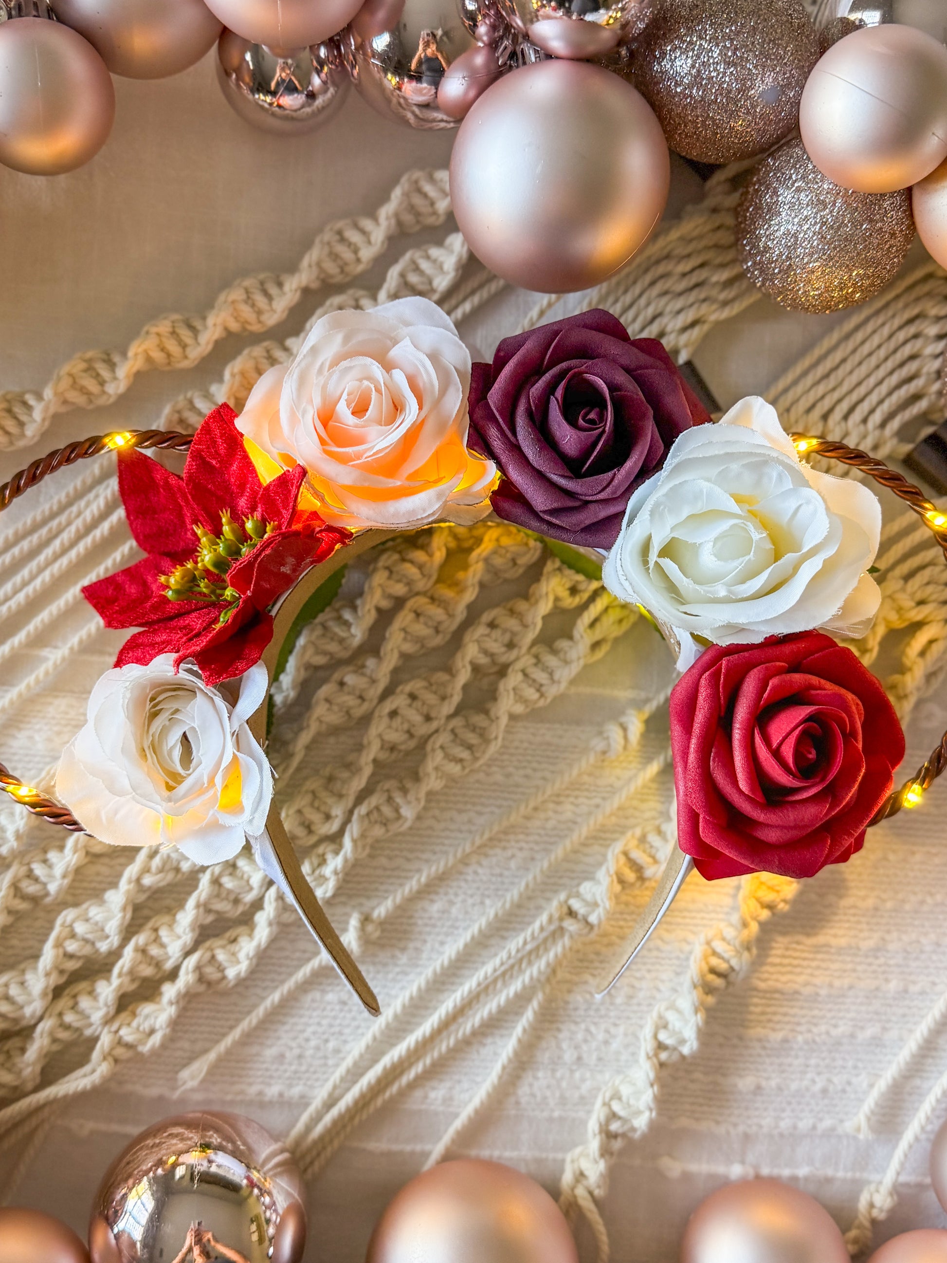 Our Candy Cane crown is created with a white headband, bronze wire ears, and a string of warm white lights with a hidden on/off switch.