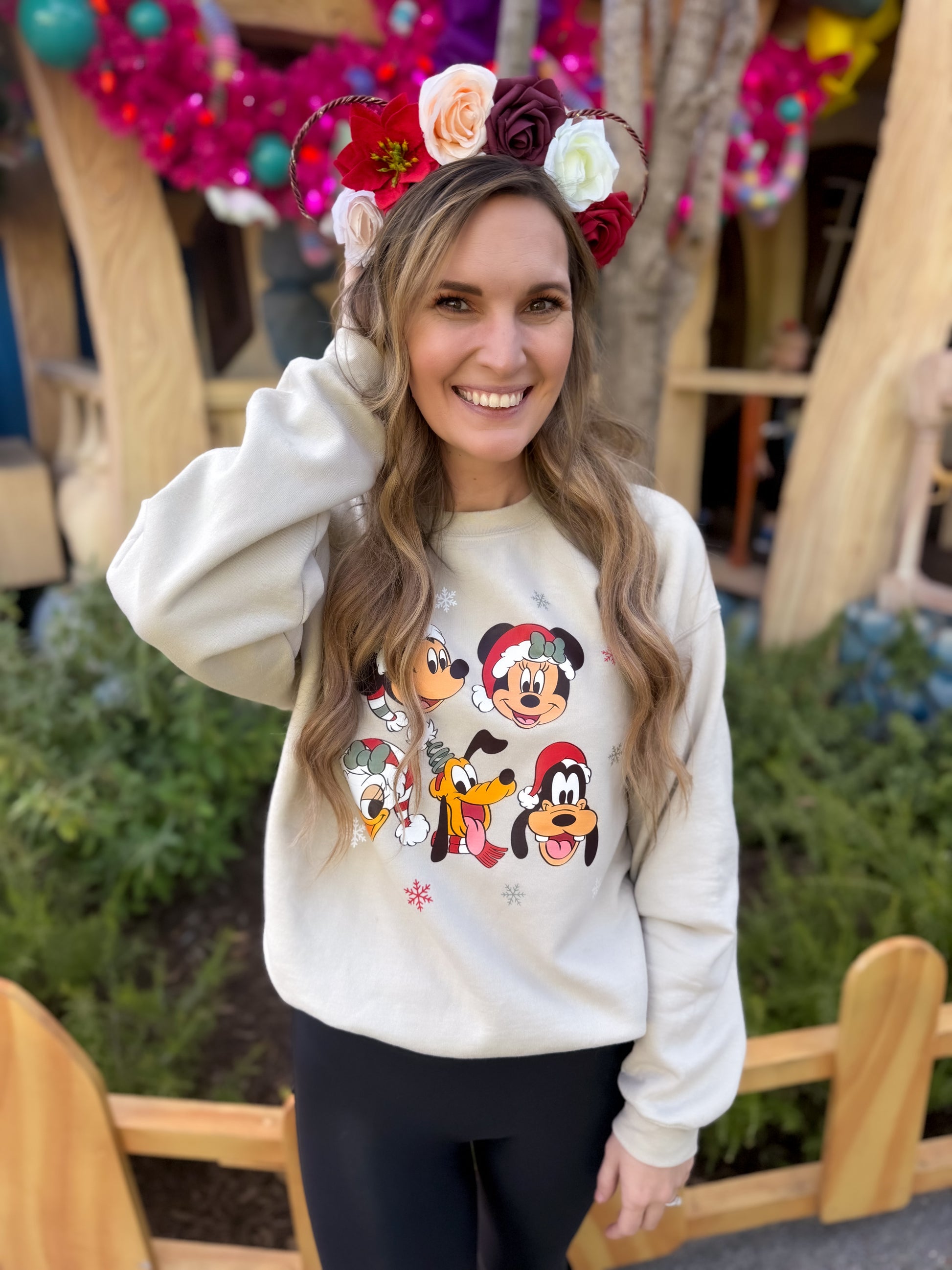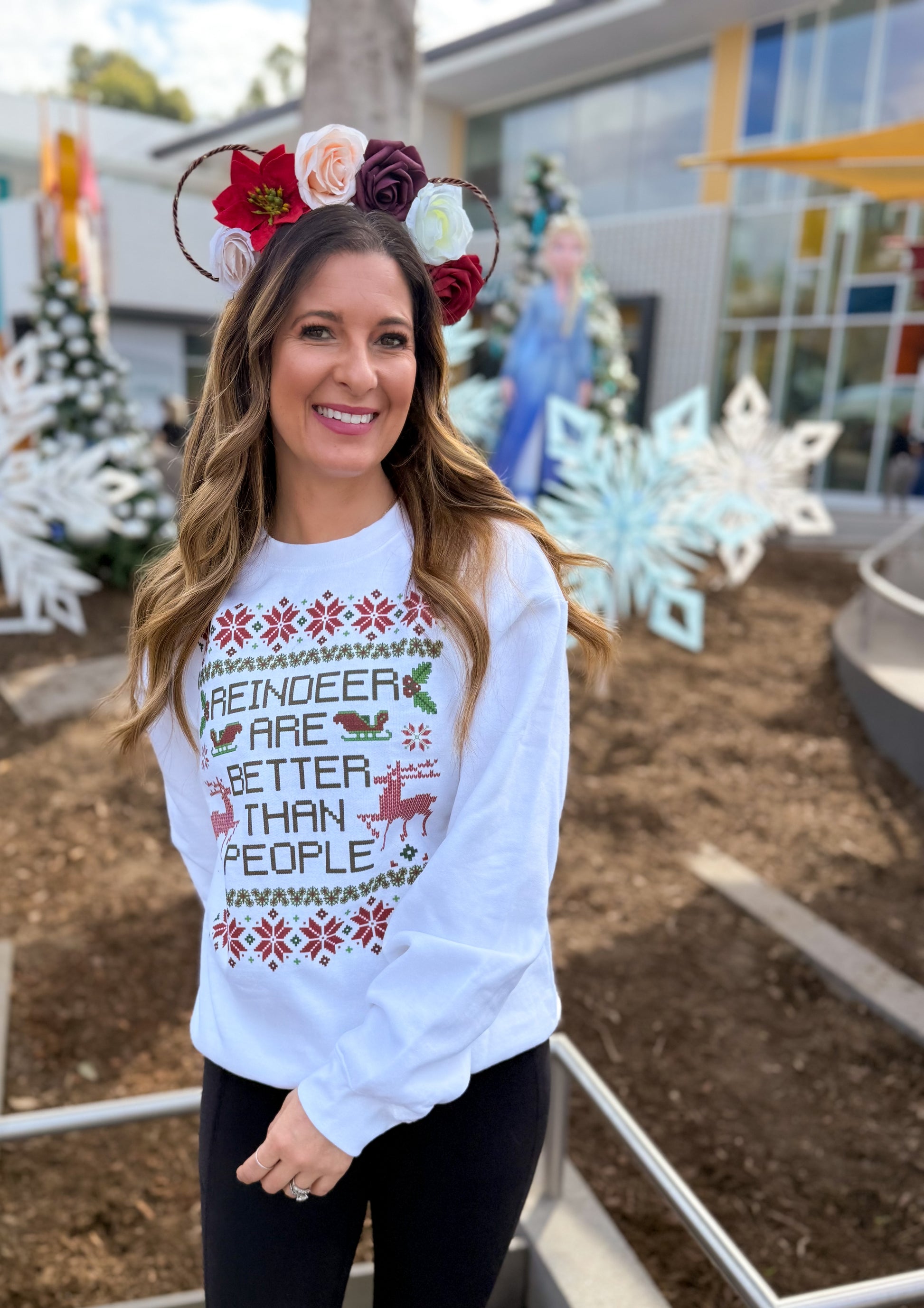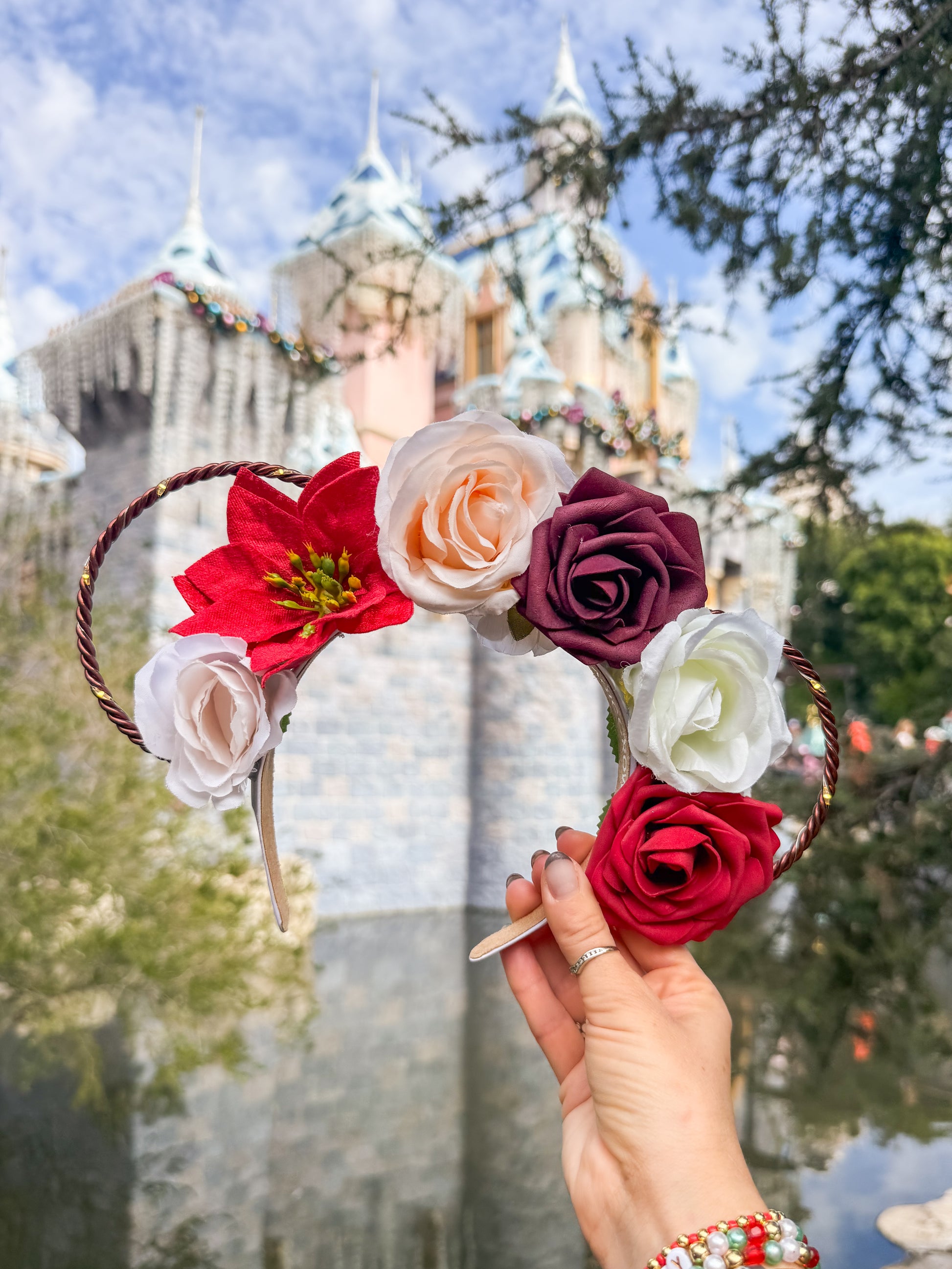 Our Candy Cane crown is created with a white headband, bronze wire ears, and a string of warm white lights with a hidden on/off switch.