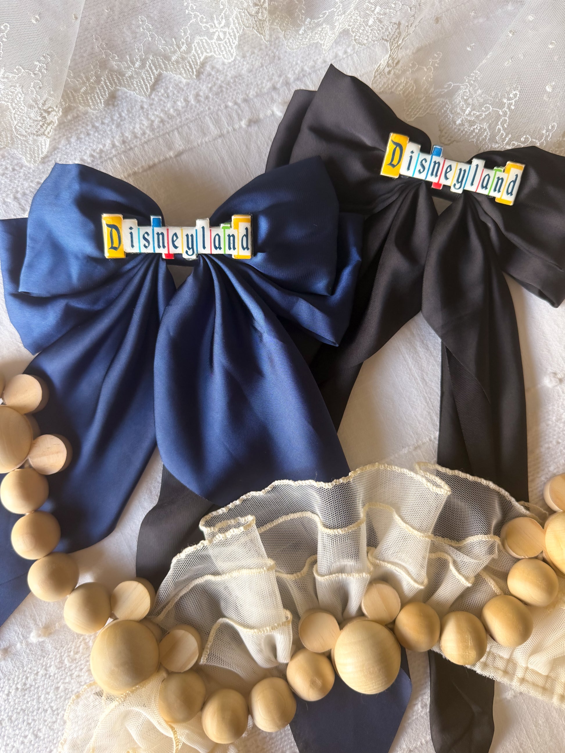 Each bow comes attached to a barrette and completed with an acrylic Disneyland embellishment adhered onto the front