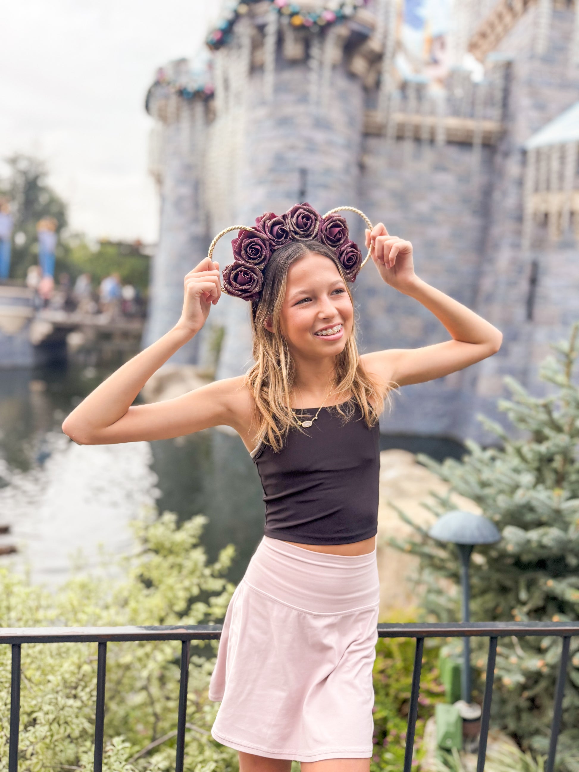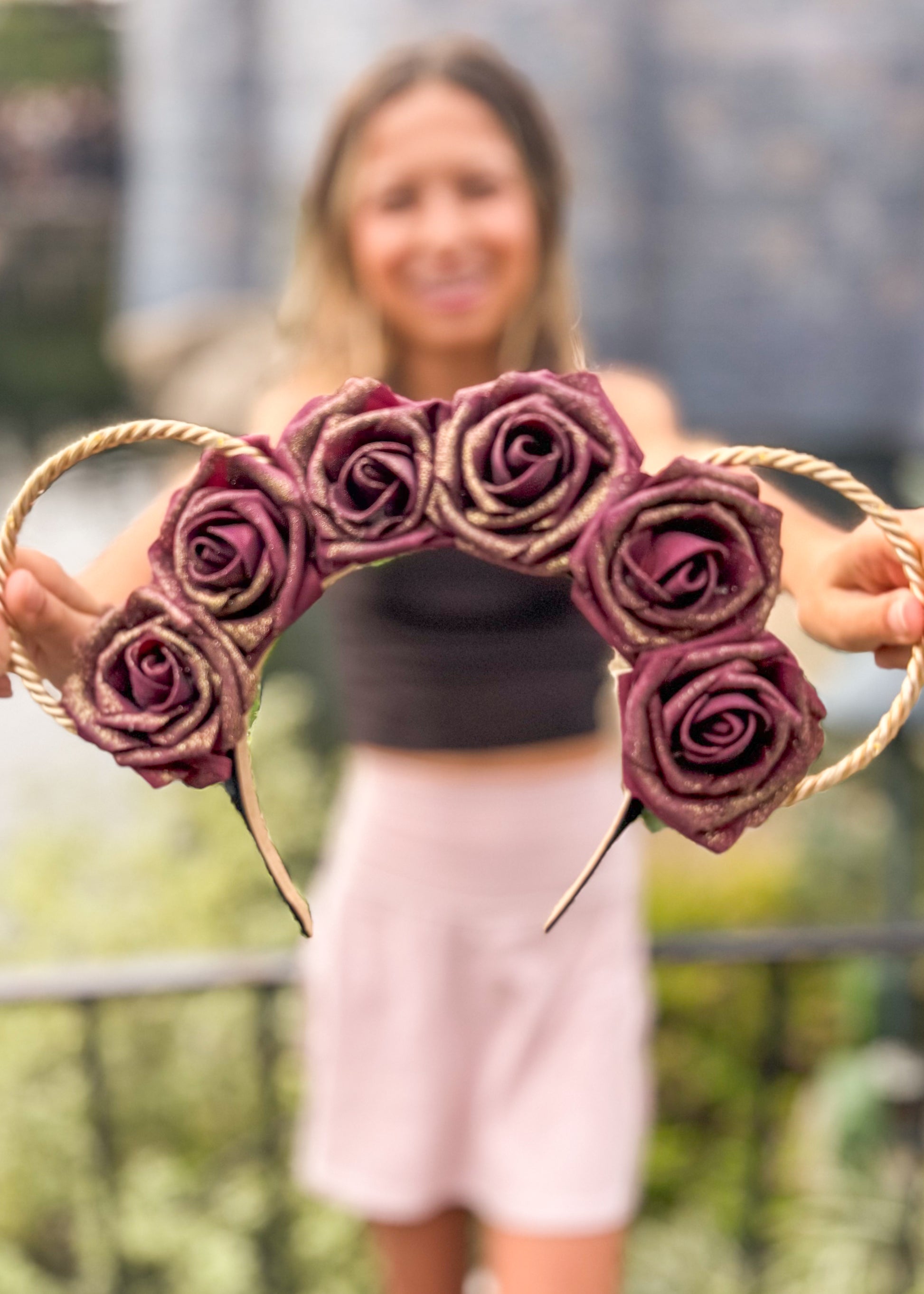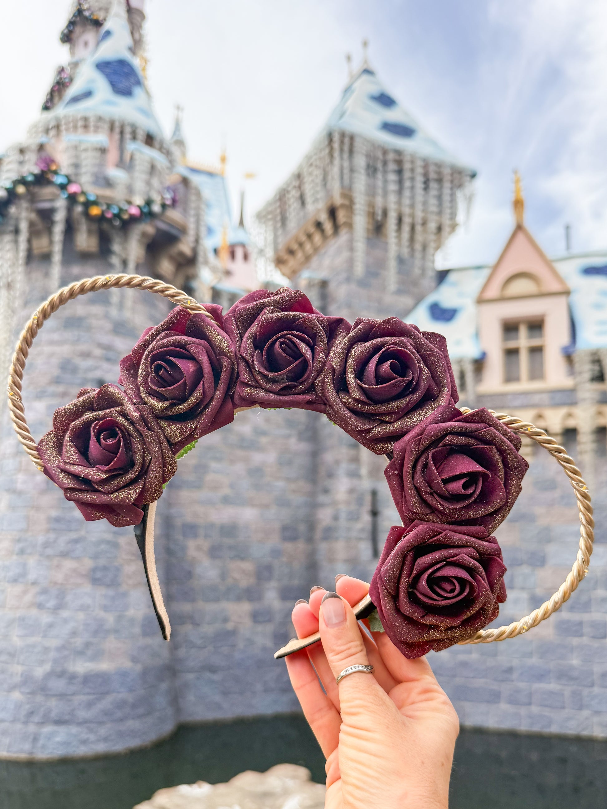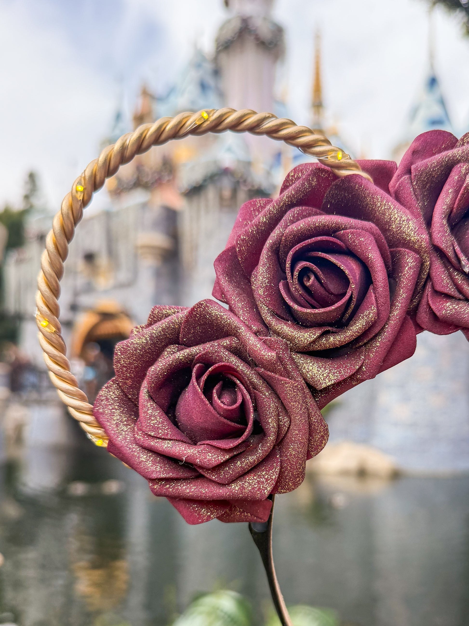 Our Candy Cane crown is created with a black headband, gold wire ears, and a string of warm white lights with a hidden on/off switch.