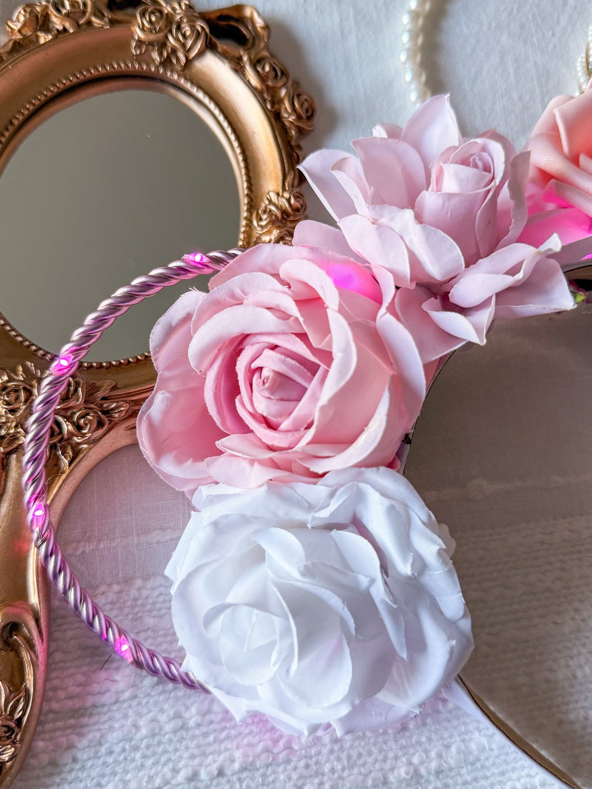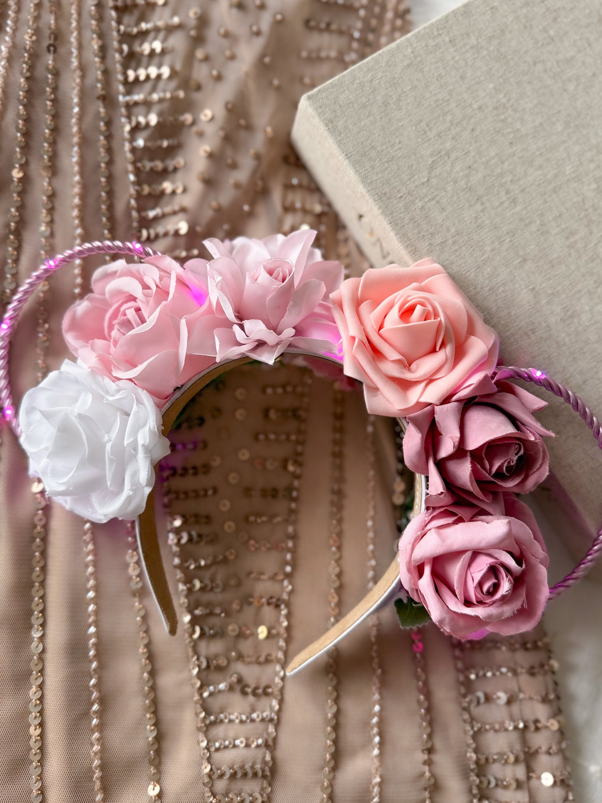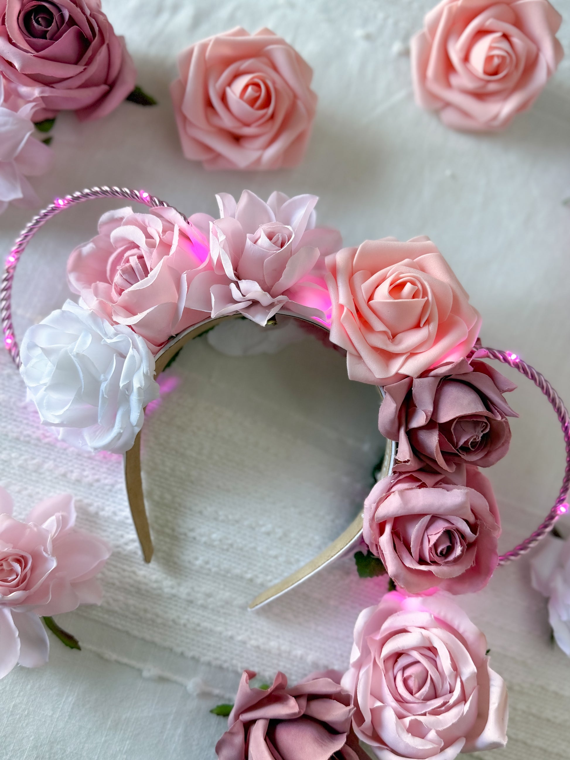 Our Everlasting Love is created with a white headband, pink wire ears, and a string of pink lights with a hidden on/off switch.