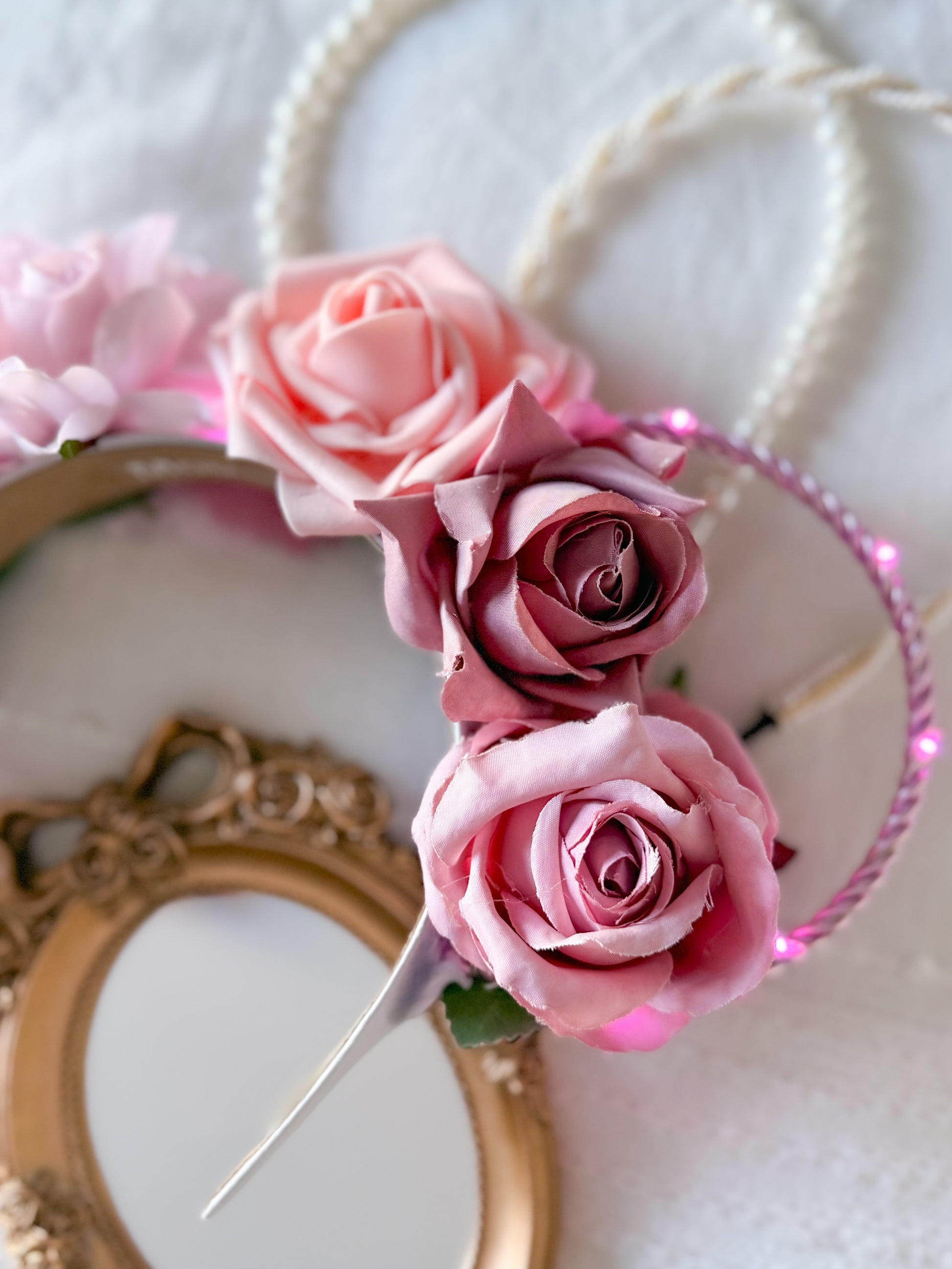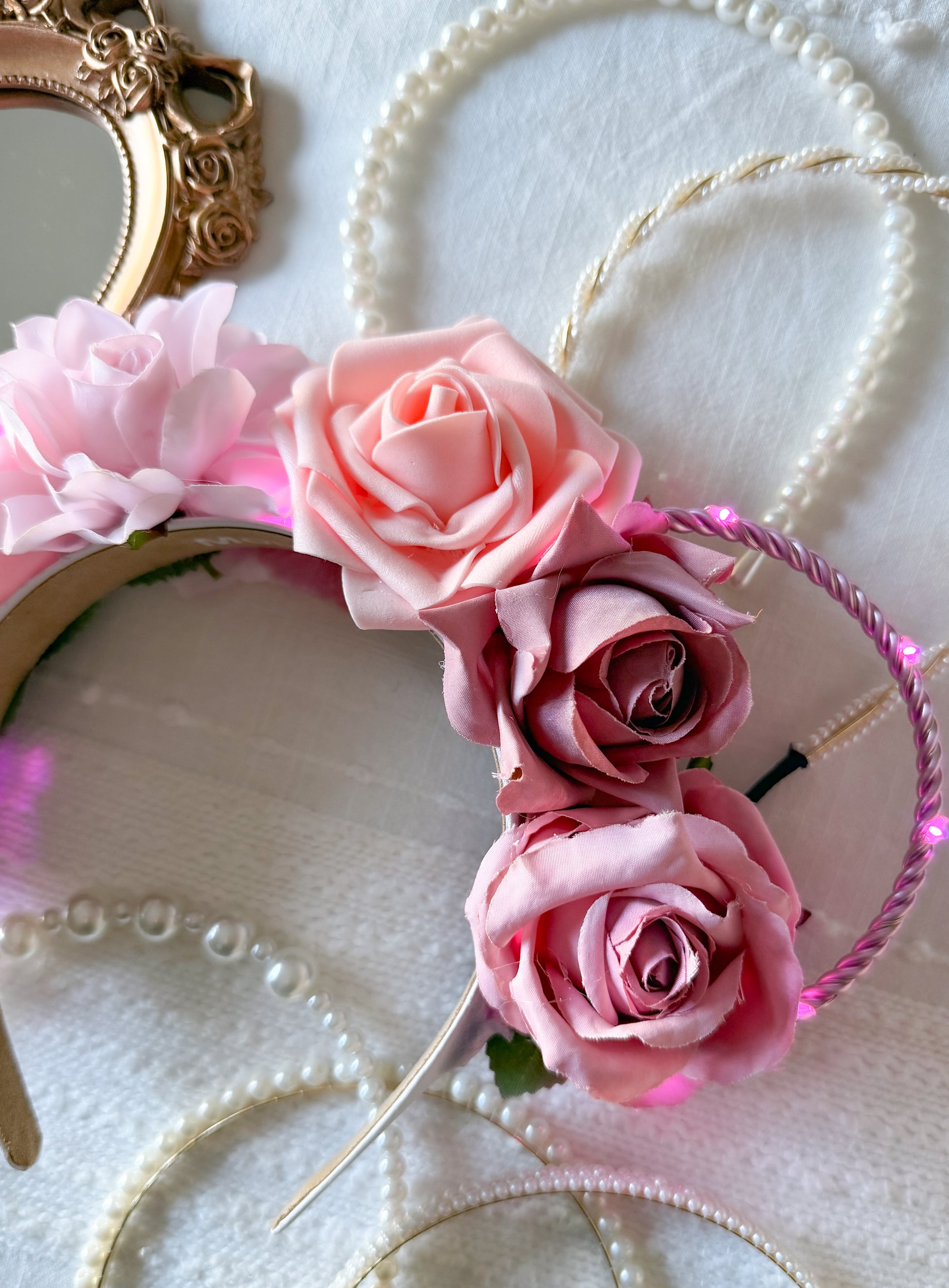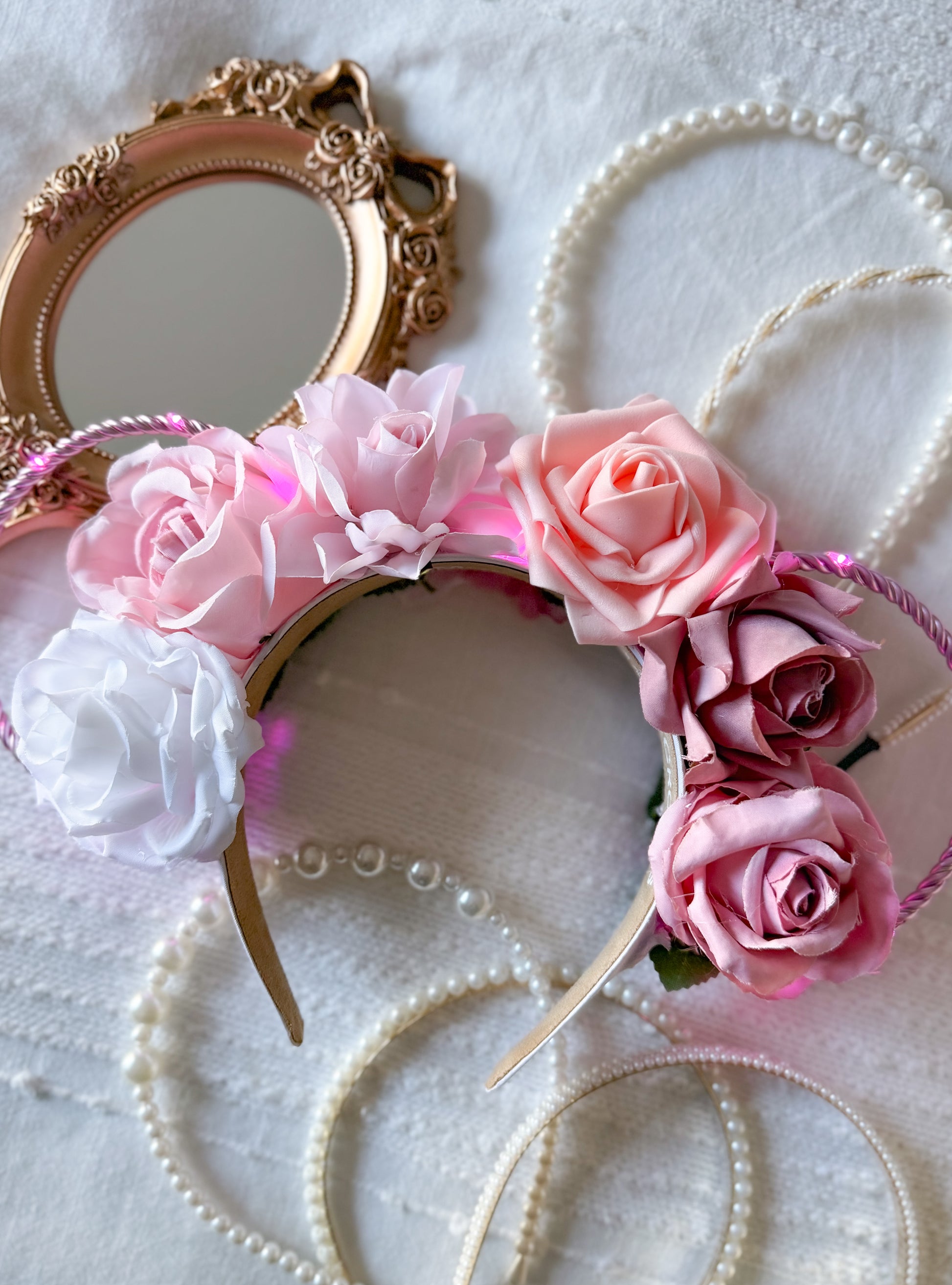 Our Everlasting Love is created with a white headband, pink wire ears, and a string of pink lights with a hidden on/off switch.