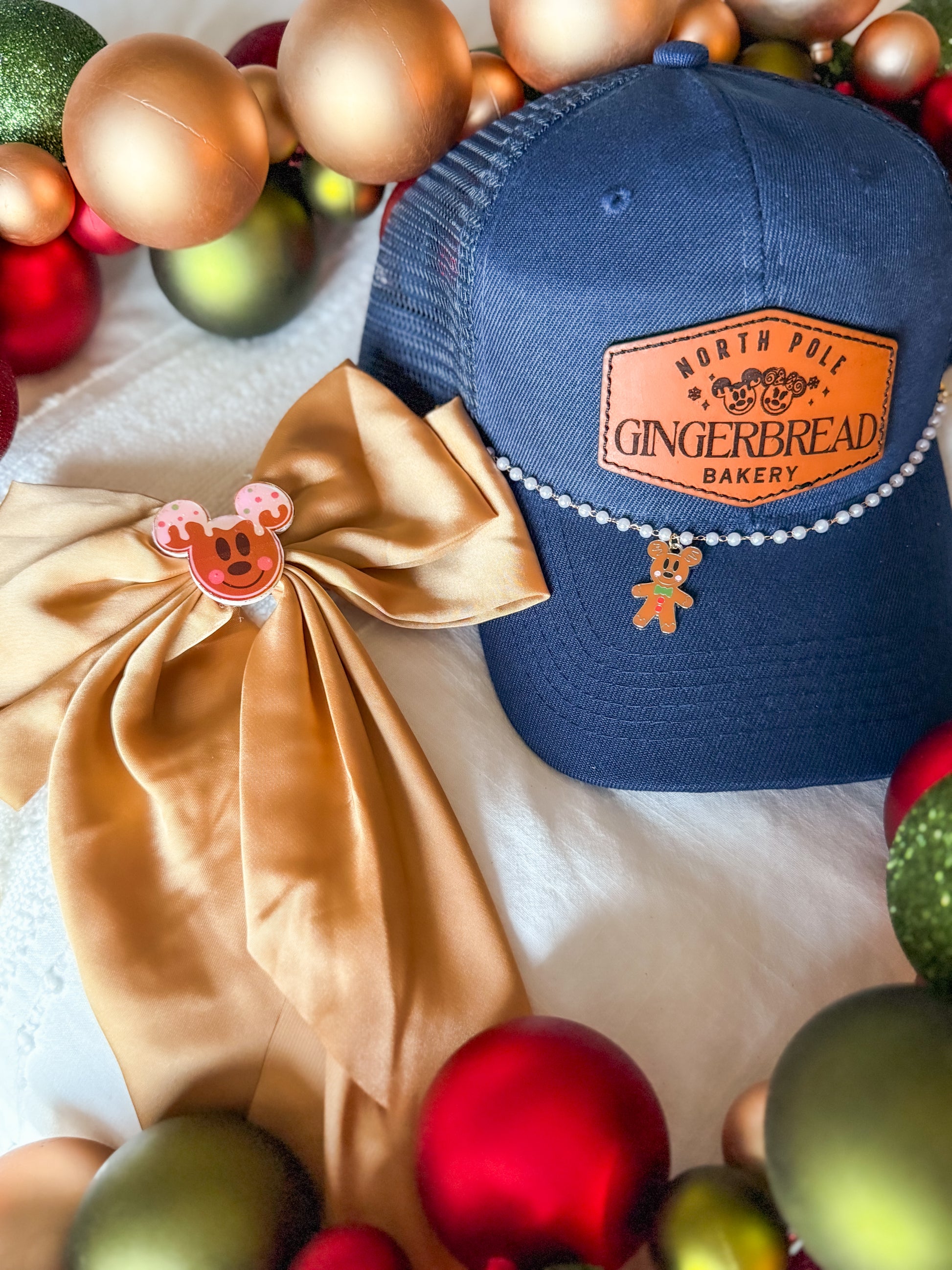 Every hat features a high-quality, laser-engraved leather patch, with an 18k gold chain and a coordinating Mickey or Minnie Gingerbread charm that hangs below.