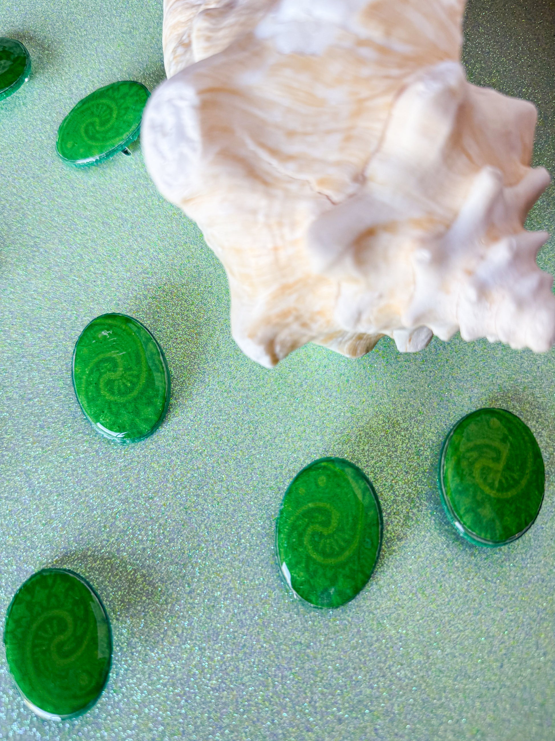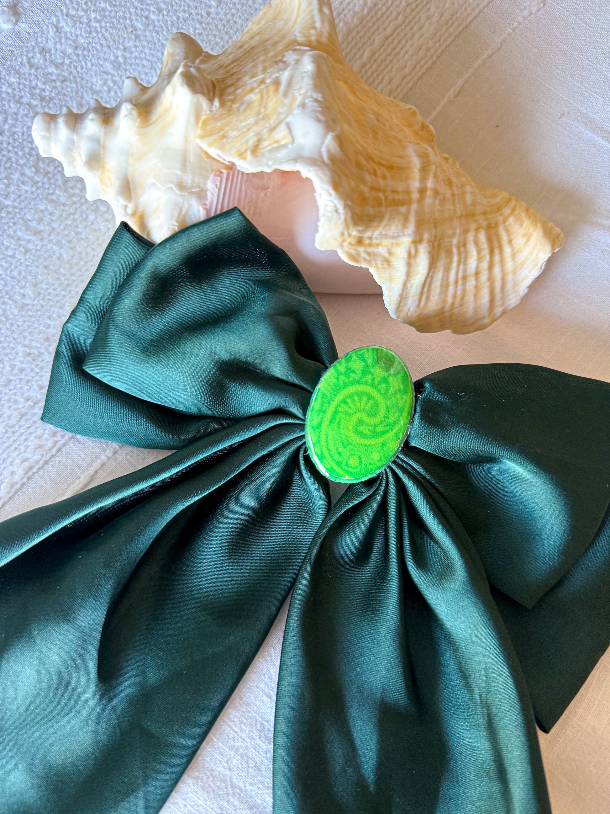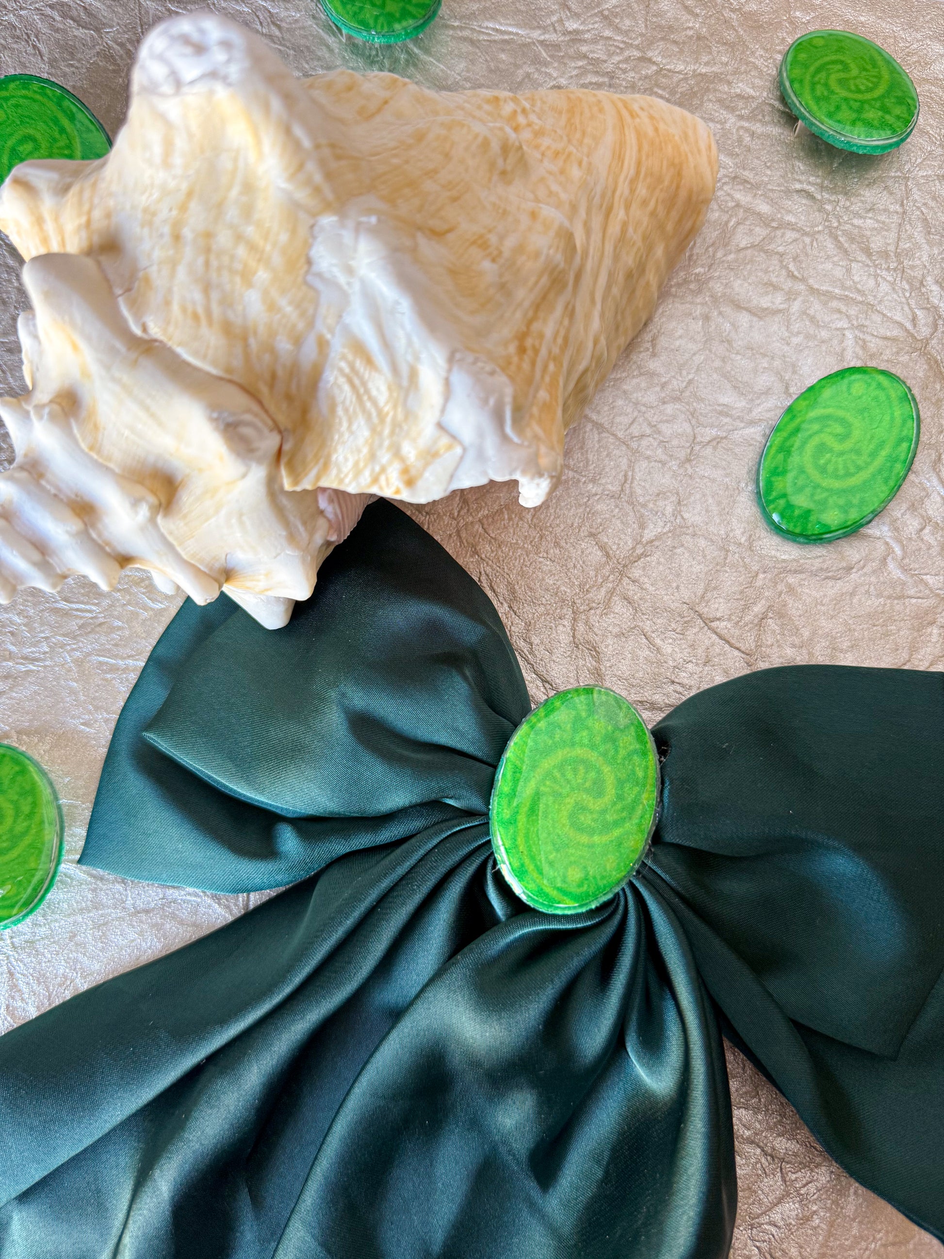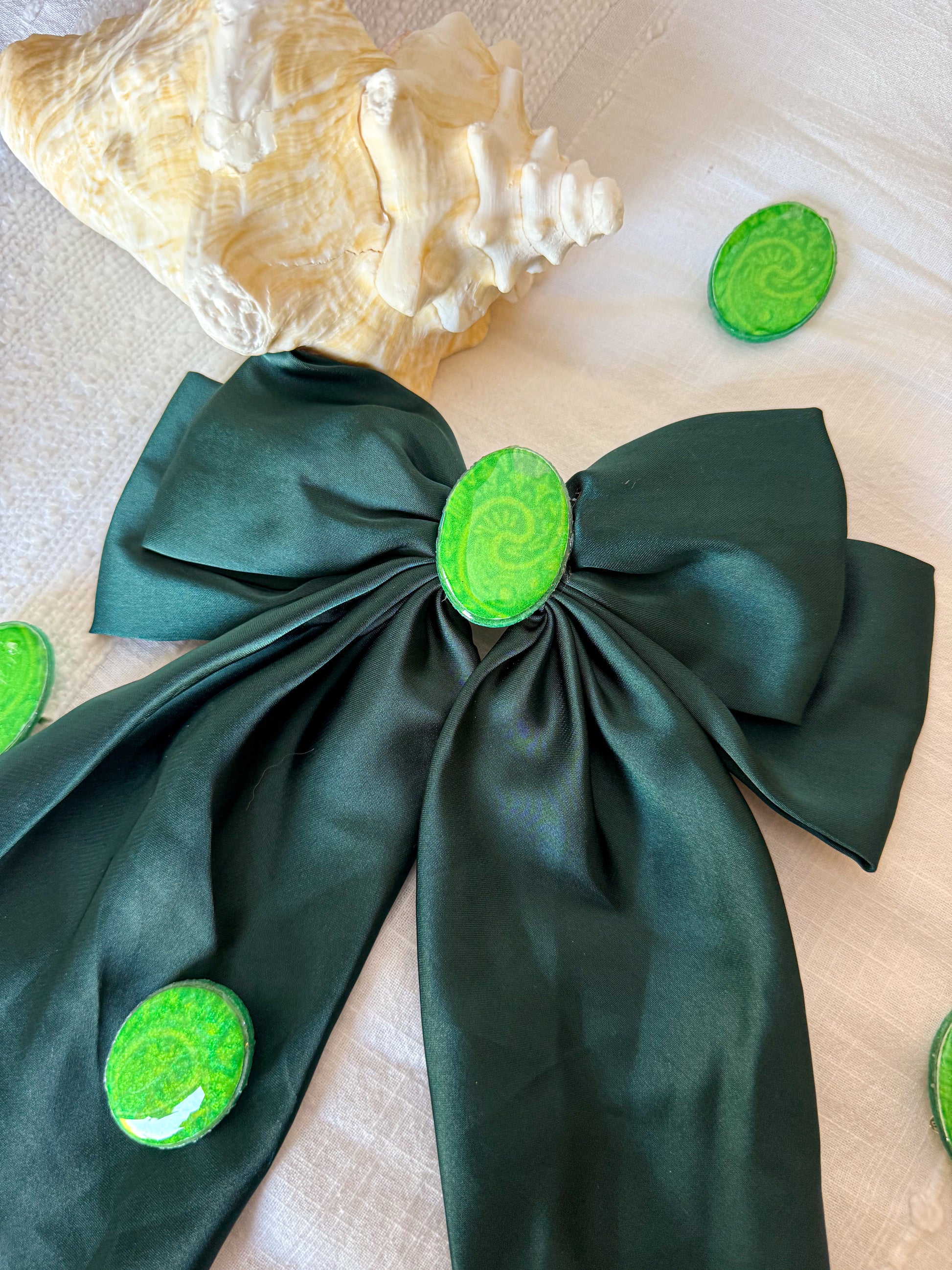 Each bow comes attached to a barrette and completed with an acrylic Heart of Te Fiti adhered in front
