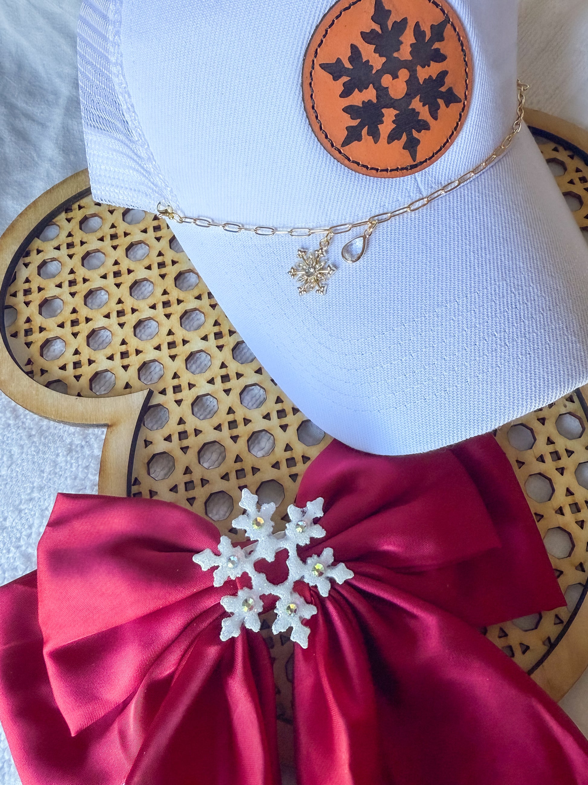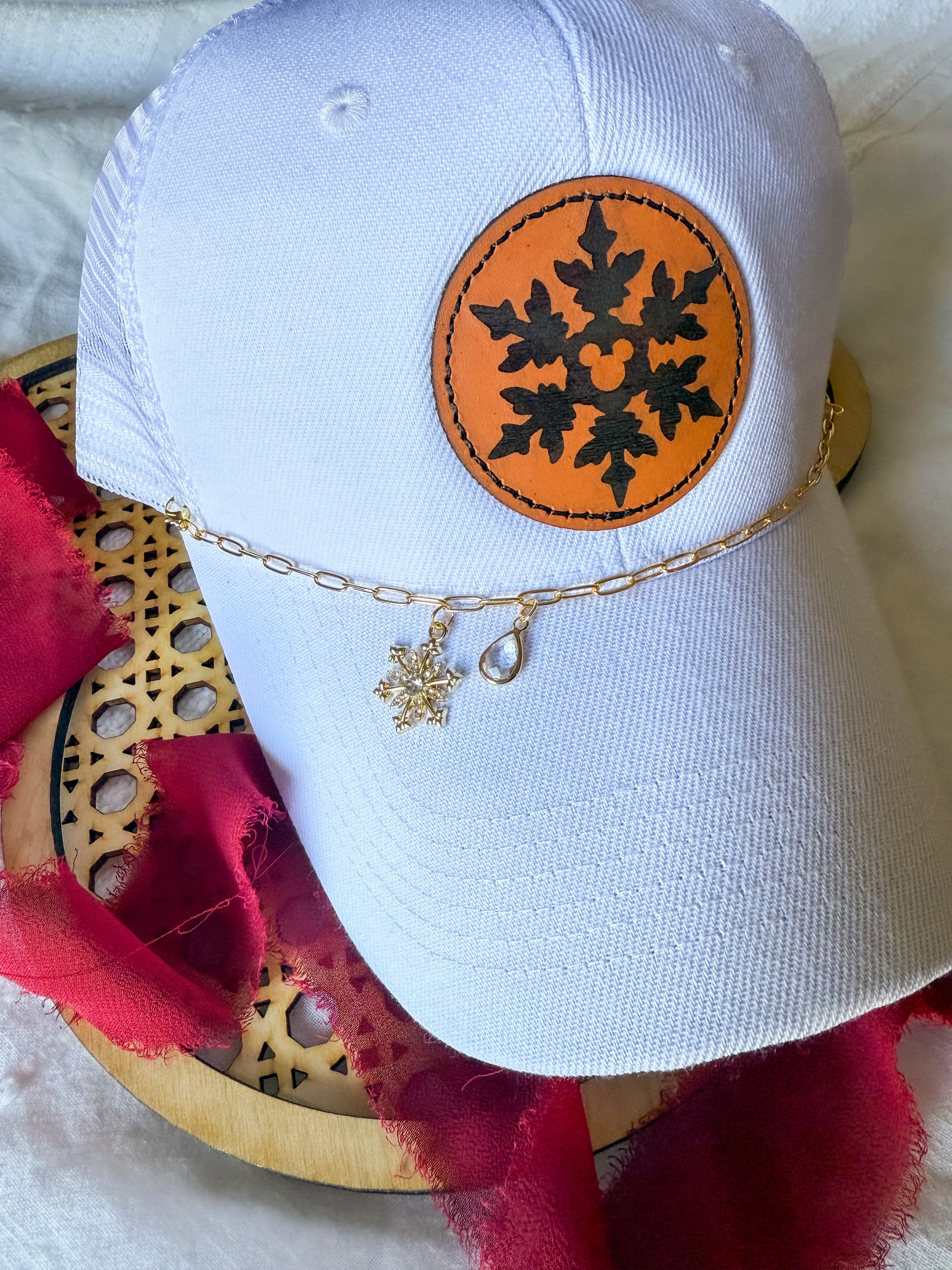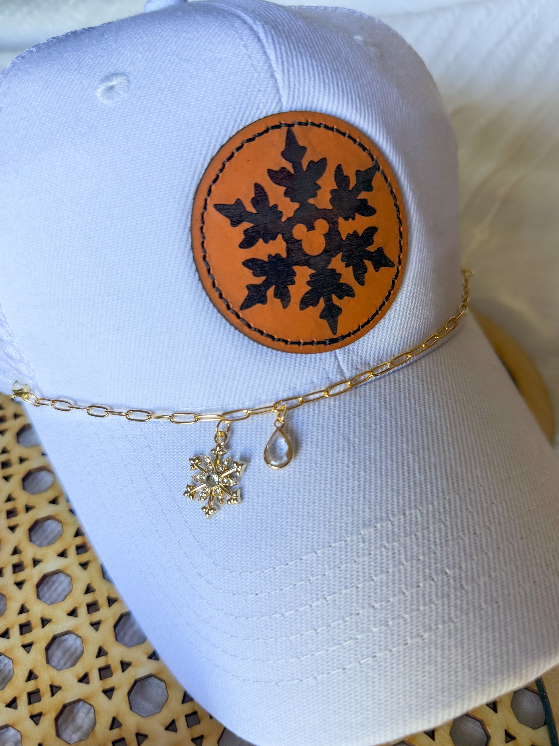 Every hat features a high-quality, laser-engraved leather patch, with an 18k gold chain and a coordinating snowflake and diamond crystal charms that hangs below.