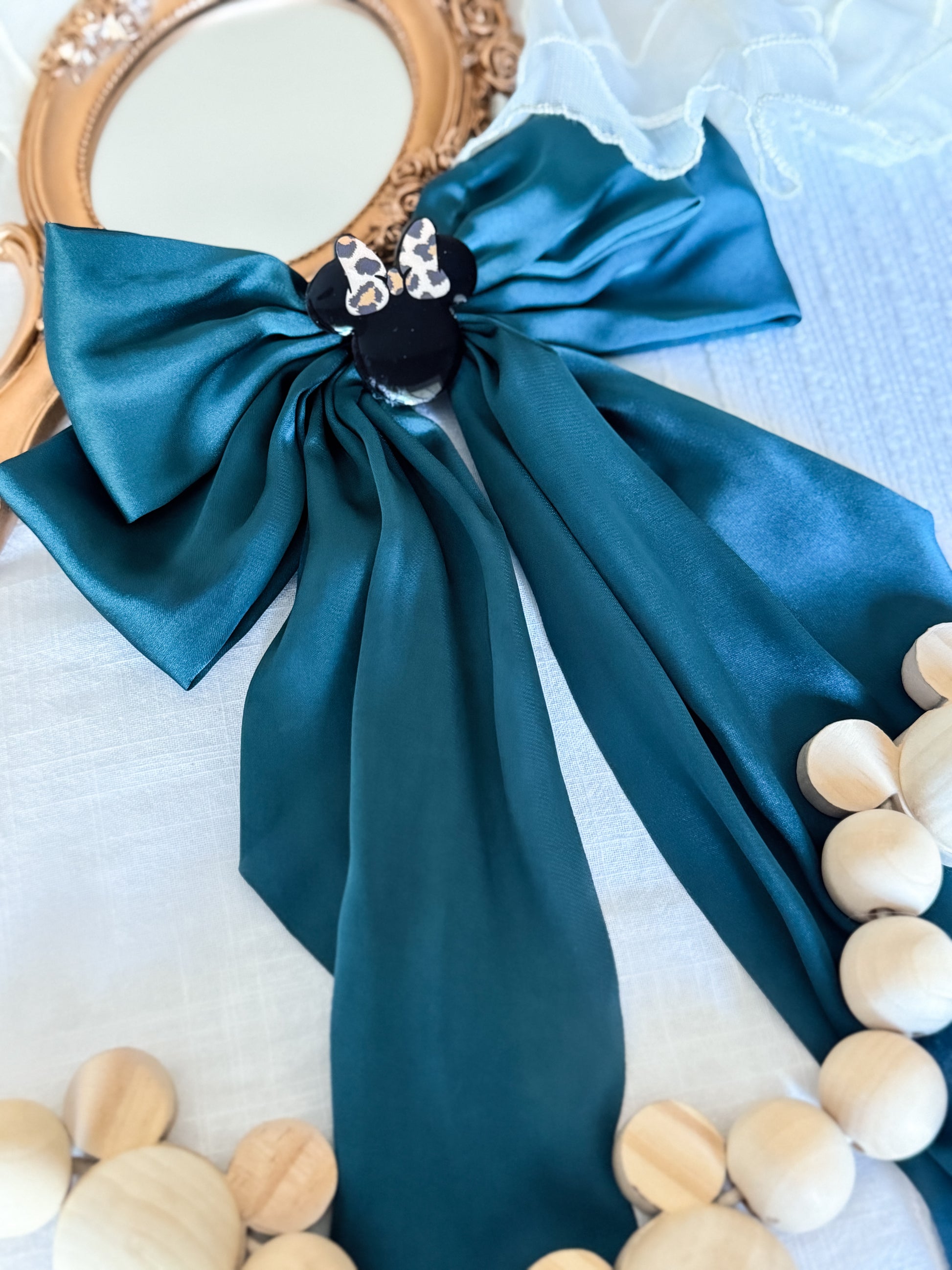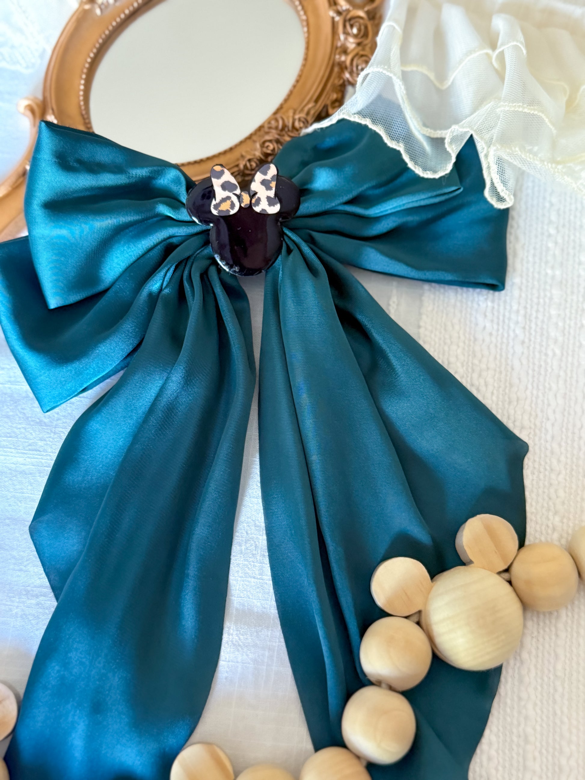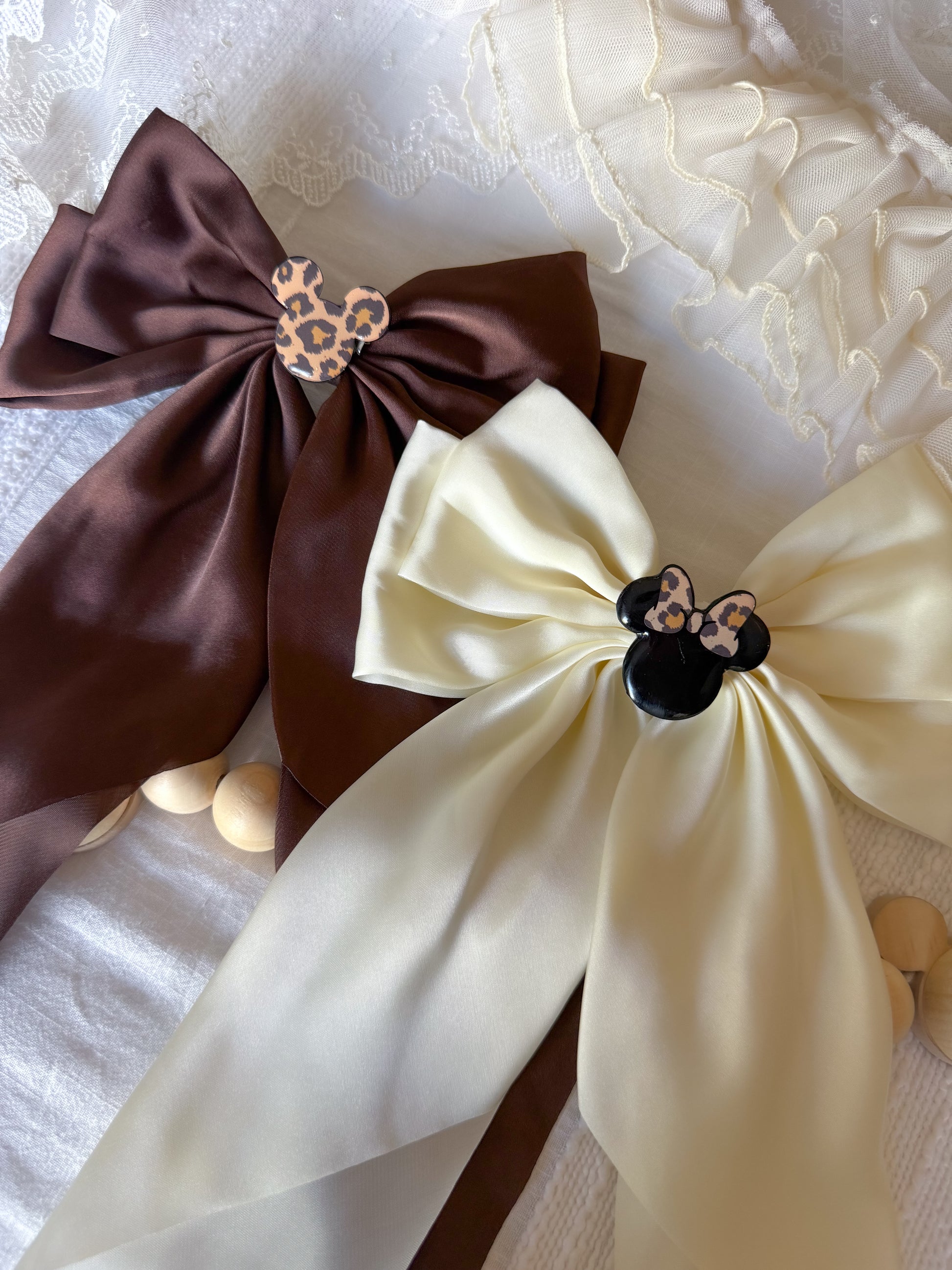 Each bow comes attached to a barrette and completed with an acrylic mouse safari embellishment adhered onto the front. Our Mickey safari embellishment is only available on the brown bow and the Minnie safari embellishment is available on the white or green bow.