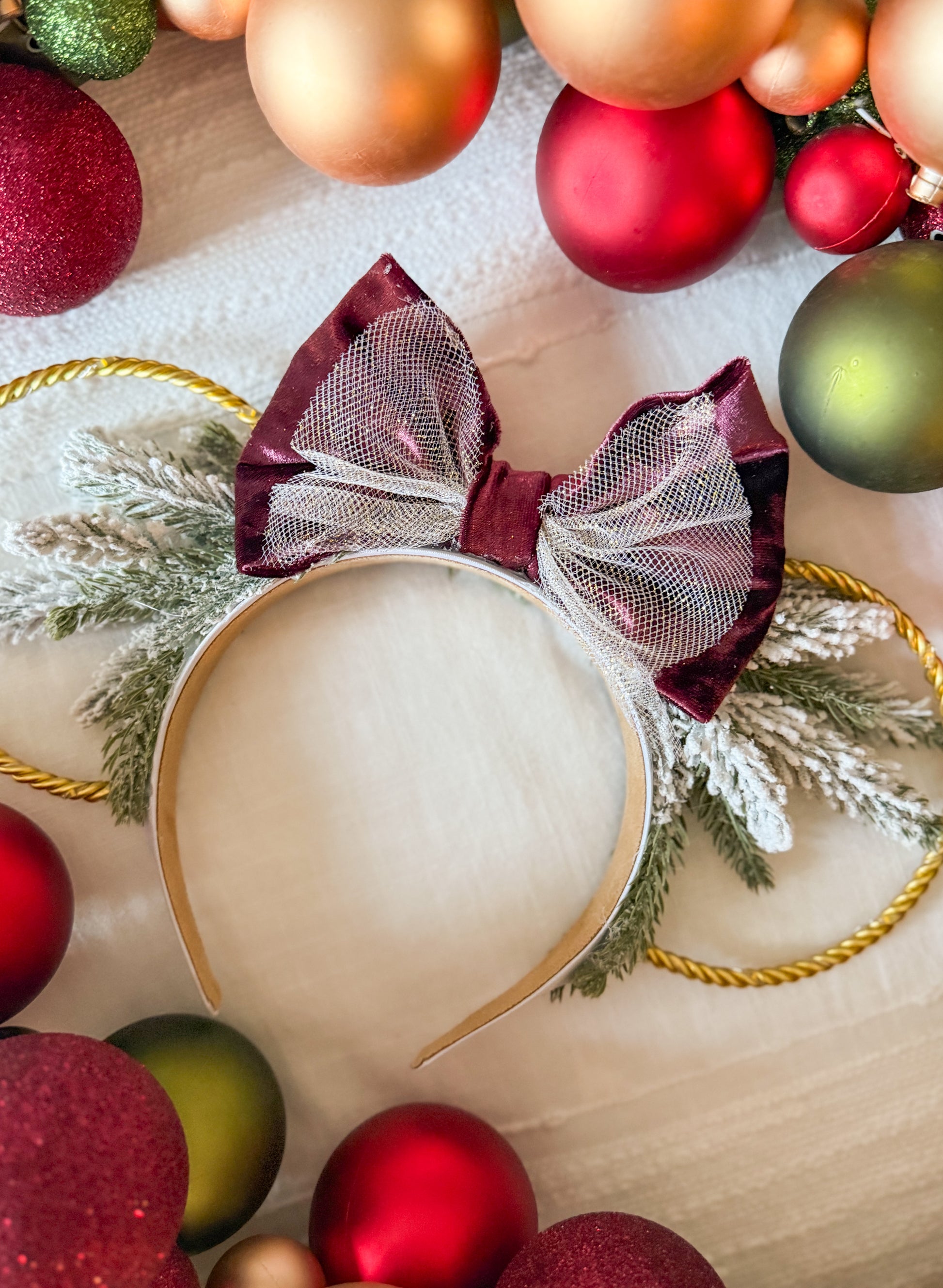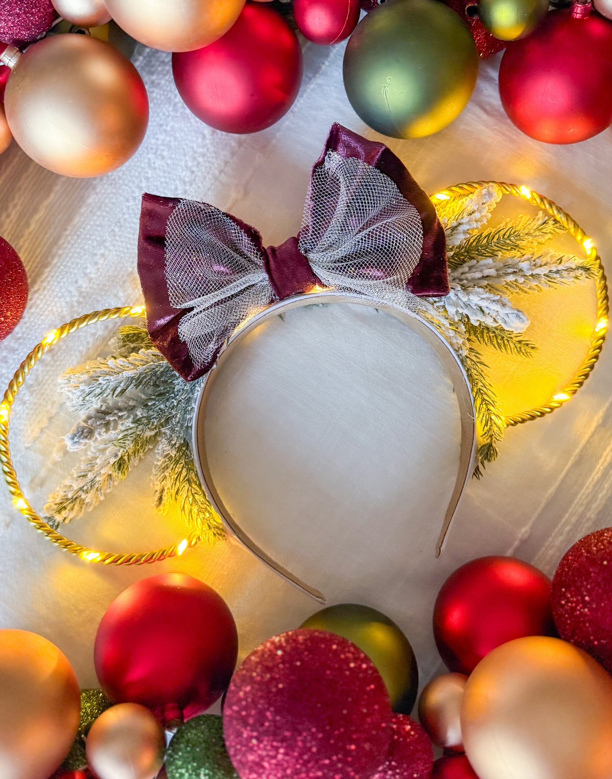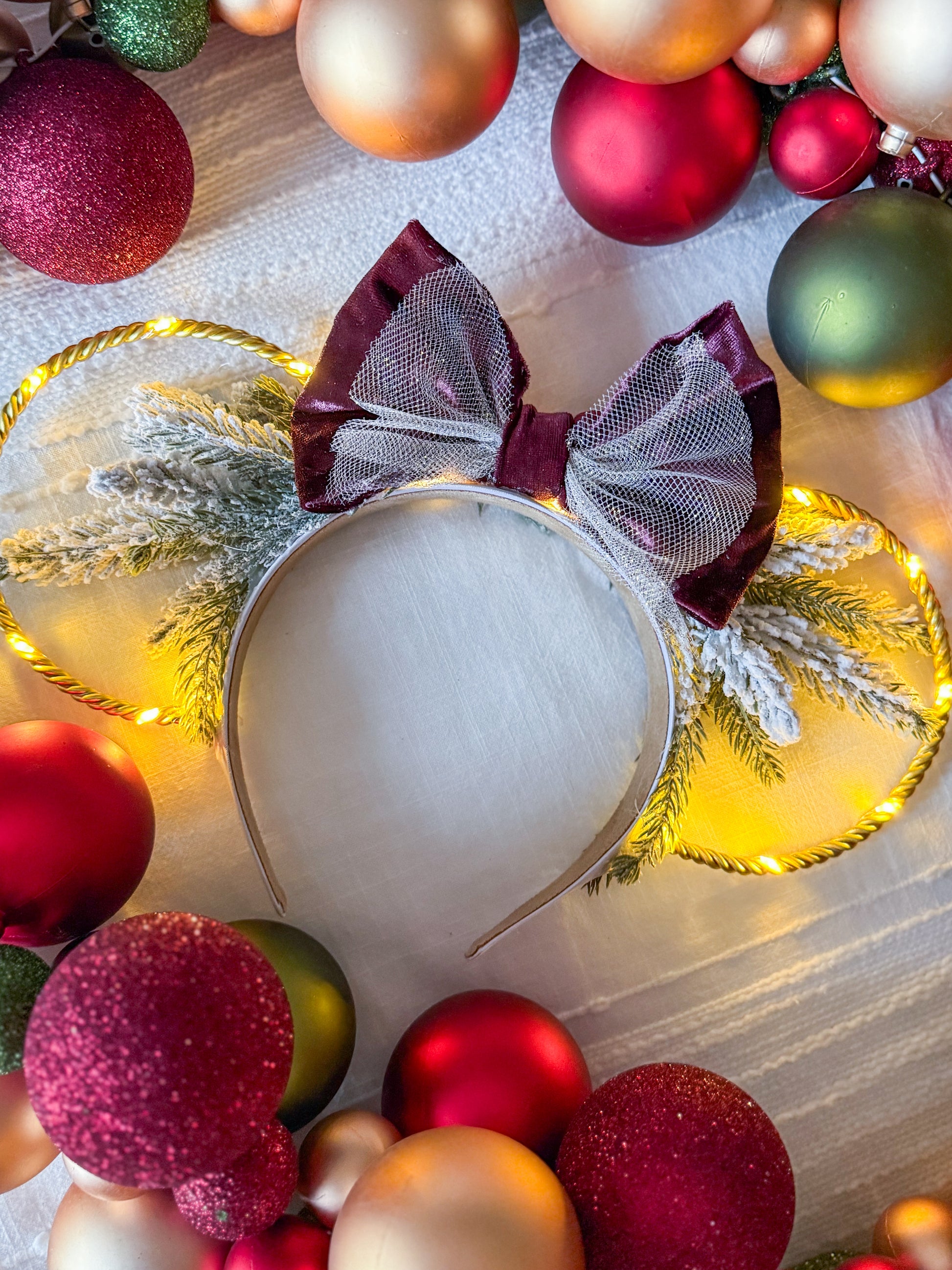 Our mistletoe crown is created with a white headband, gold wire ears, and a string of warm white lights with a hidden on/off switch.