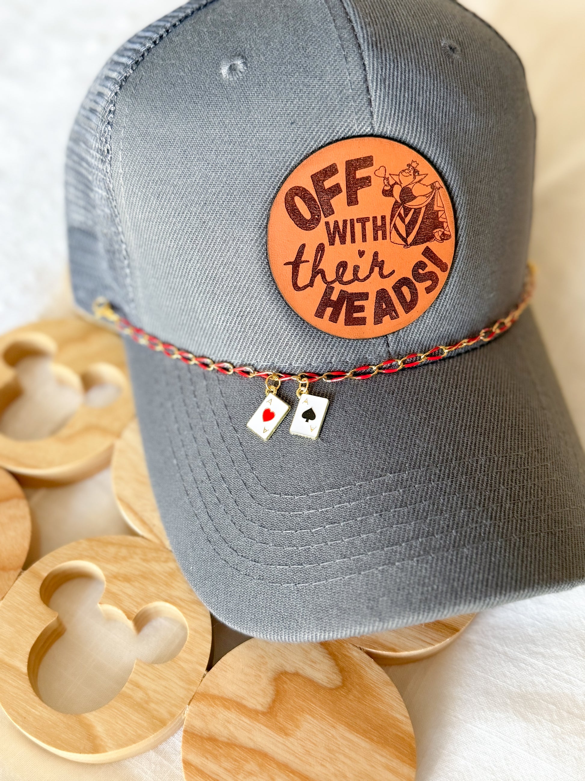 Every hat features a high-quality, laser-engraved leather patch, with your choice of an 18k gold chain or stainless steel chain with 2 coordinating card charms that hangs below.
