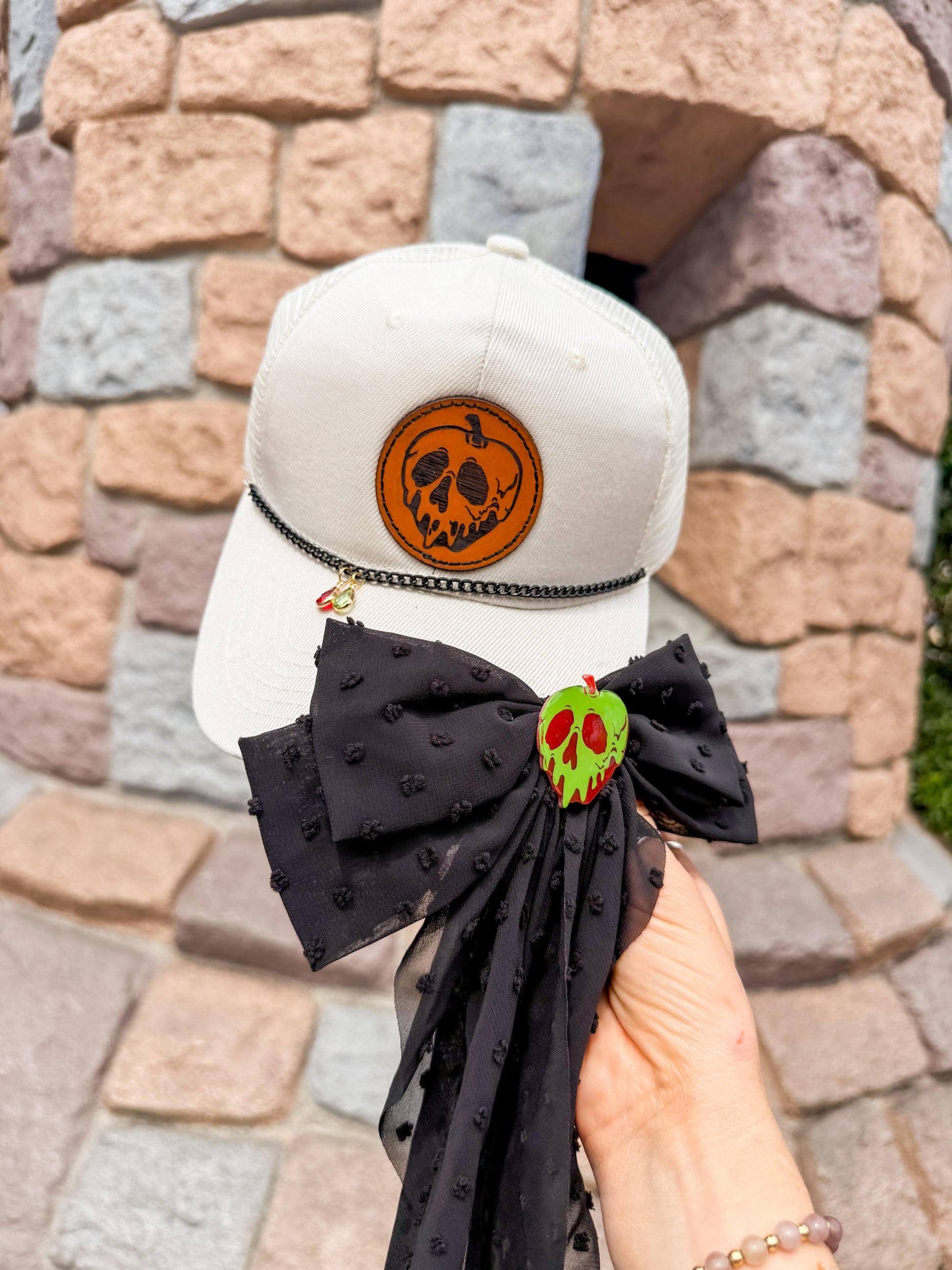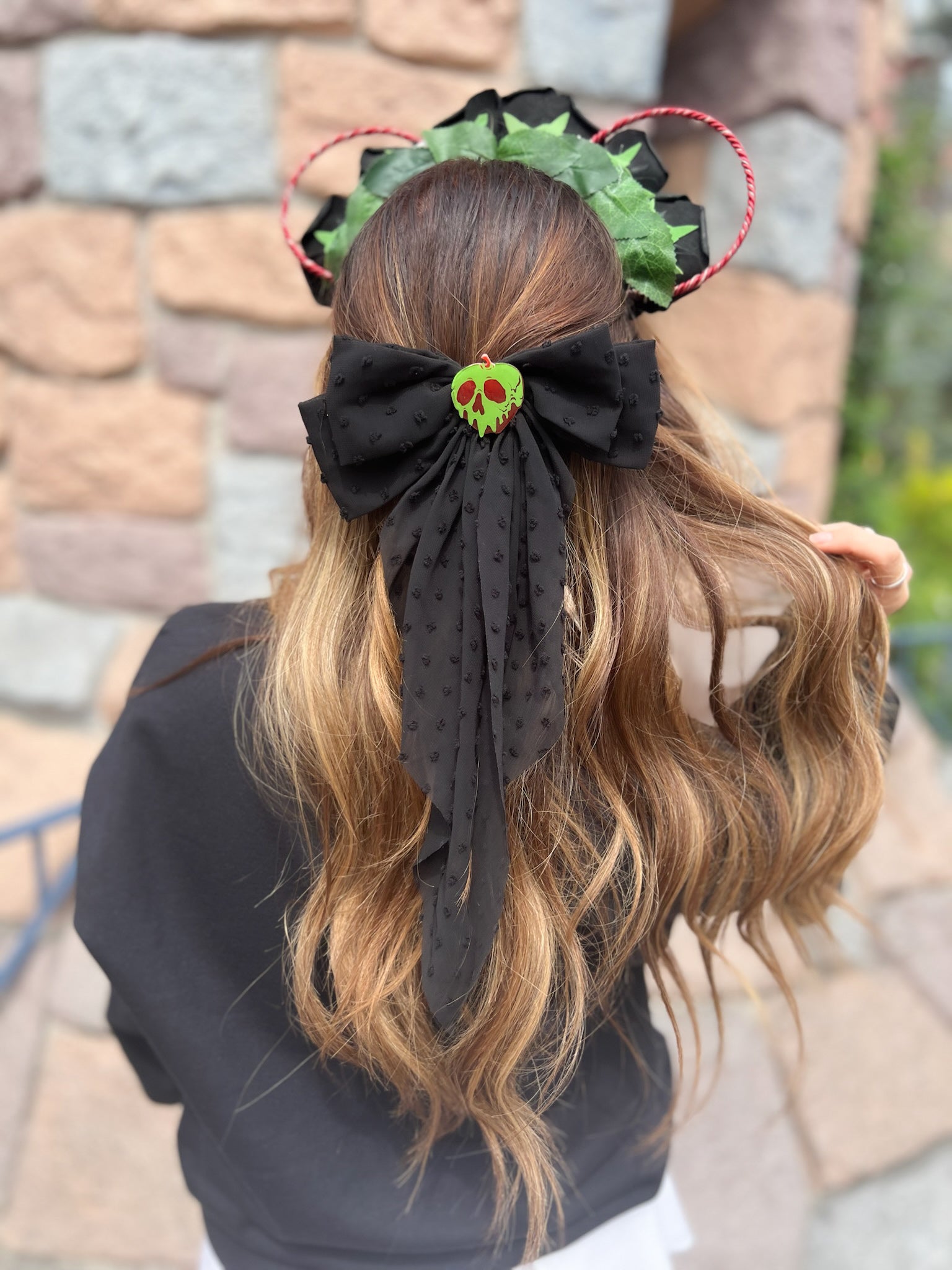 Each bow comes attached to a barrette and completed with an acrylic poison apple adhered in front