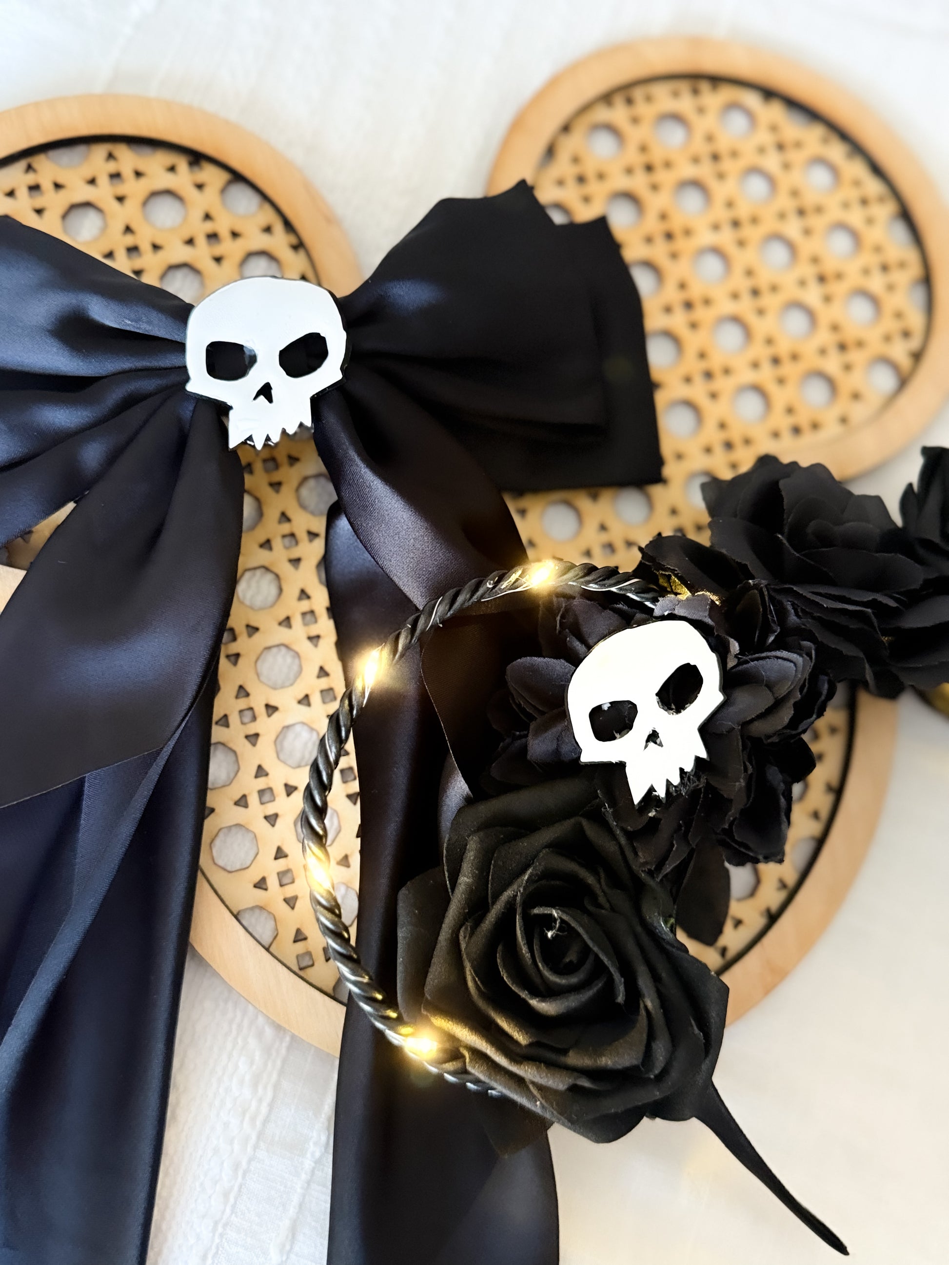 Each bow comes attached to a barrette and is completed with an acrylic skull embellishment, seen on Sid's shirt, adhered to the front