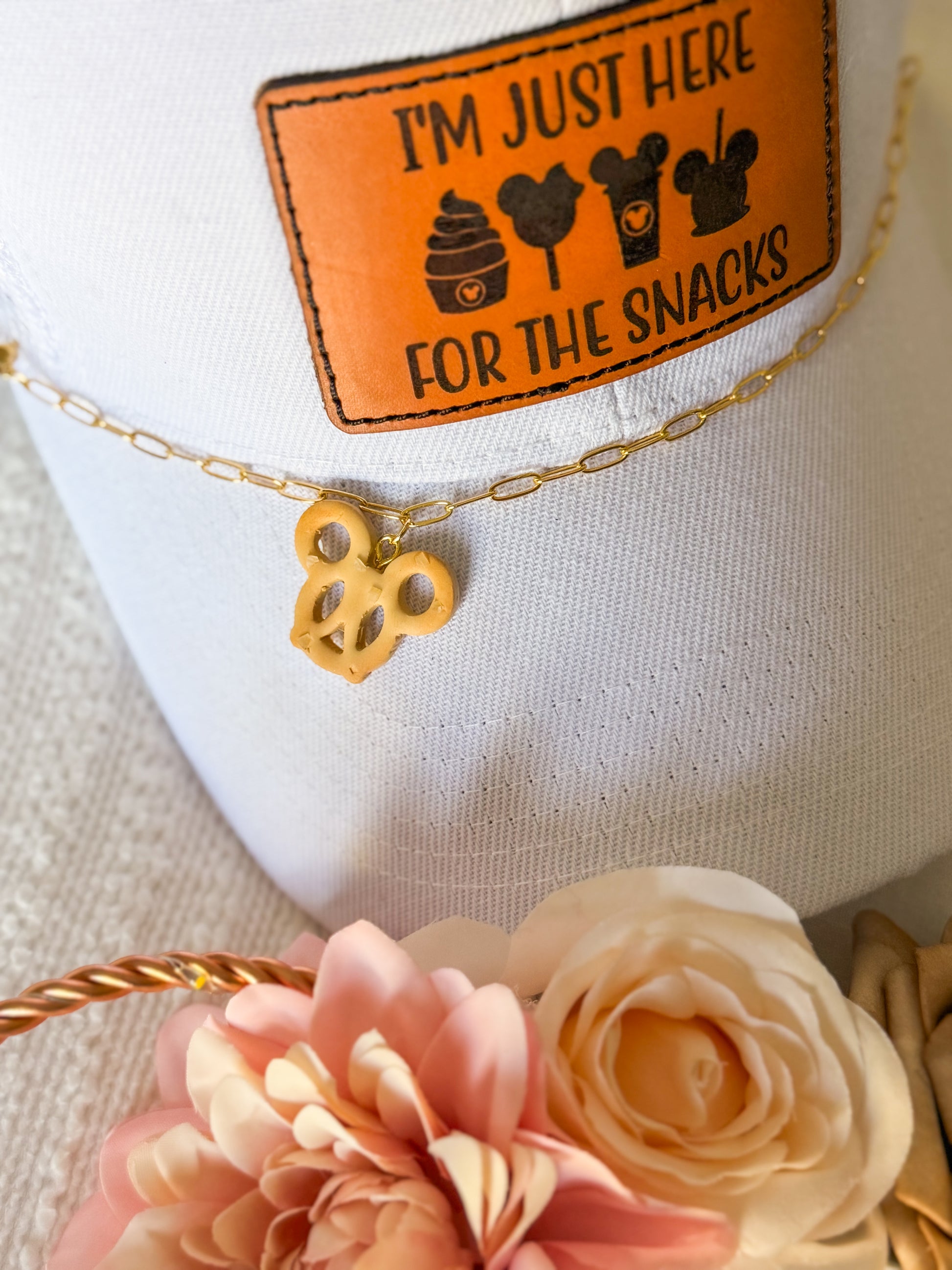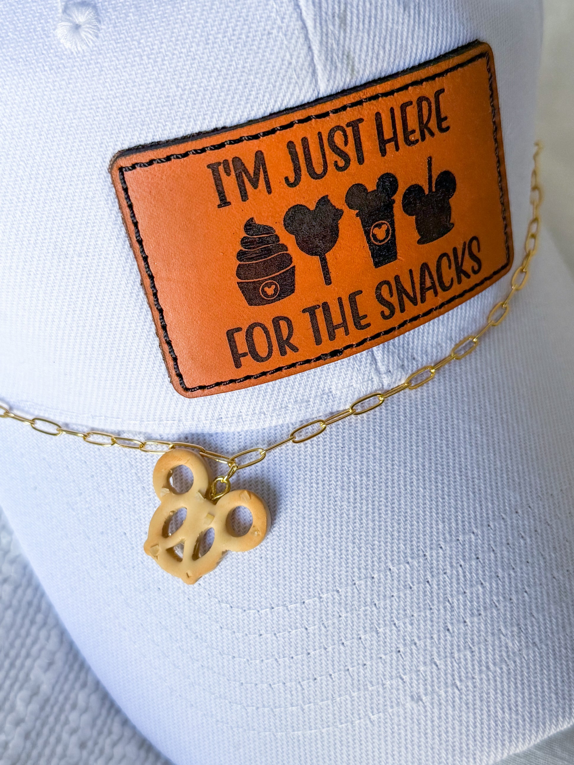 Every hat features a high-quality, laser-engraved leather patch, with your choice of an 18k gold chain or stainless steel chain with a handmade Mickey pretzel charm made by @calidreamindesigns that hangs below.